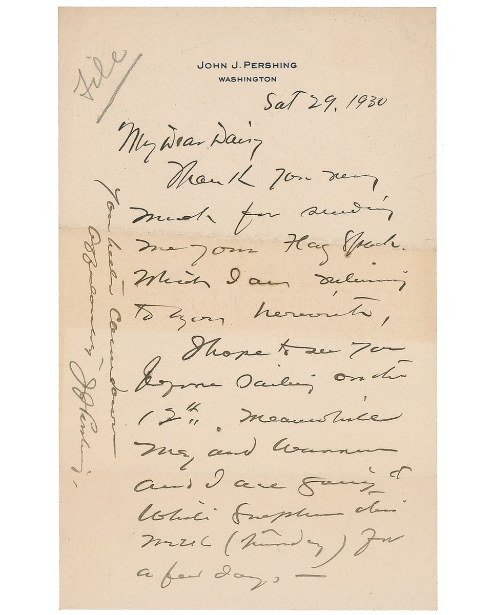 ALS vertically signed “J. J. Pershing,” one page, 5.5 x 8.5, personal letterhead, September 29, 1930. Pershing pens a flowing letter, in part: “Thank you very much for sending me your Flag Speech, which I am returning to you herewith. I hope to see you before sailing on the 12th.” In fine condition, with a block of toning to the middle of the text and a pencil notation.