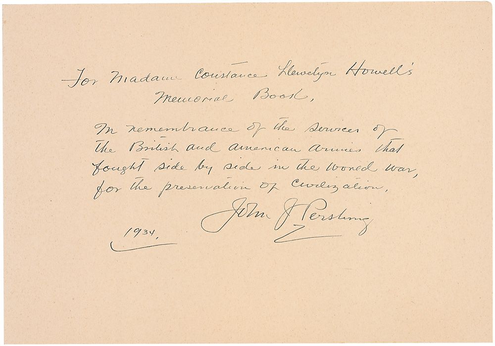 Vintage ink signature and inscription, “For Madame Constance Llewelyn Howell’s Memorial Book. In remembrance of the services of the British and American Armies that fought side by side in the World War, for the preservation of civilization. John J. Pershing 1934,” on an off-white 10 x 7 sheet. In fine condition.