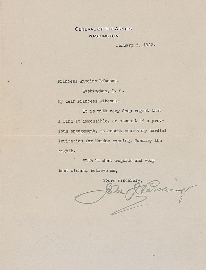 TLS, one page, 7 x 9, General of the Armies letterhead, January 5, 1923. Letter to Princess Antoine Bibesco. In part: “It is with very deep regret that I find it impossible, on account of a previous engagement, to accept your very cordial invitation for Monday evening.” In fine condition, with a few light creases and a couple trivial spots of foxing.