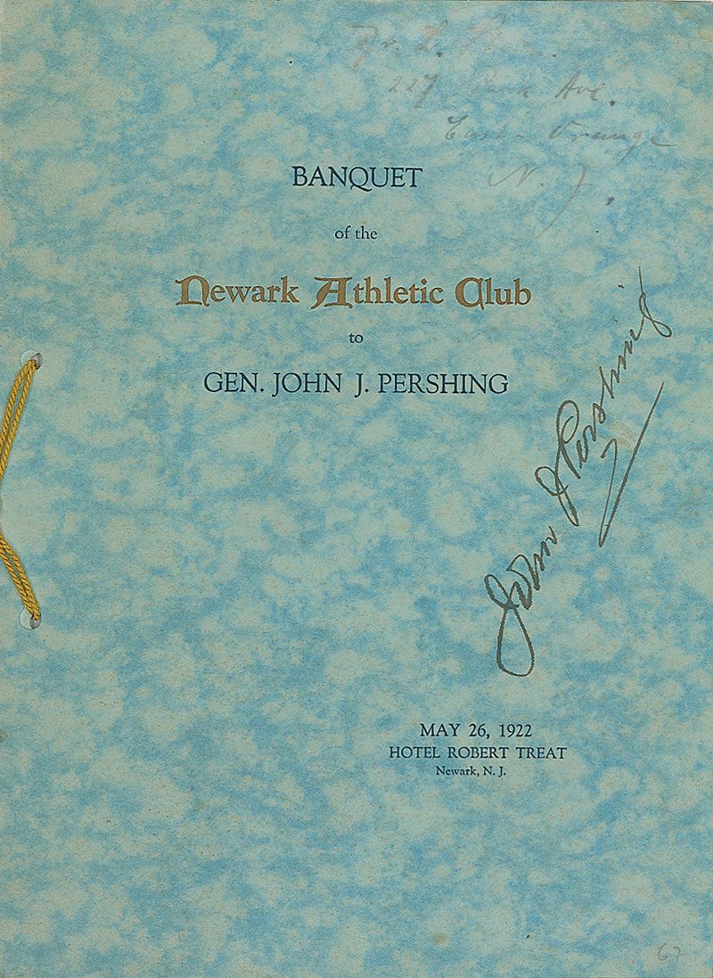 Program from a banquet of the Newark Athletic Club honoring Pershing, held on May 26, 1922, 7 x 9.5, signed on the front cover in fountain pen by Pershing. In fine condition, with a faint address in another hand on front cover, and a bit of scattered light foxing.
