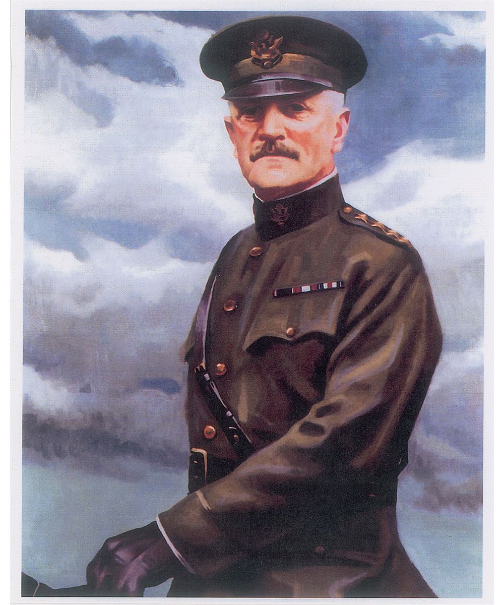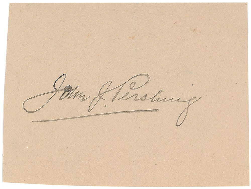 Vintage ink signature, “John J. Pershing,” on an off-white 4.5 x 3.5 album page. In fine condition, with a central vertical fold passing through a couple letters of the signature.