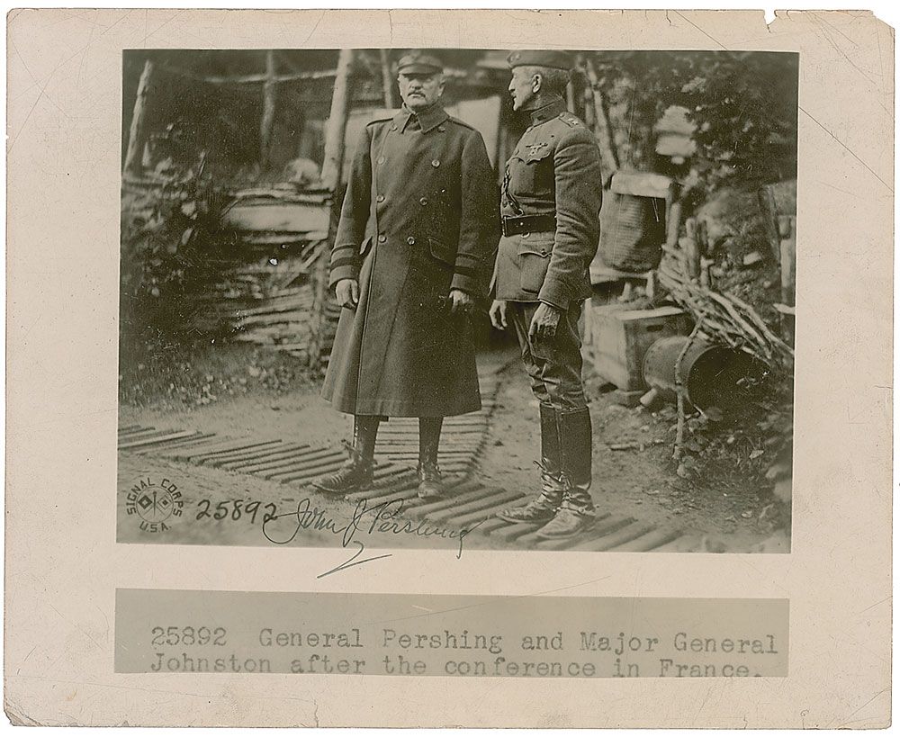 Vintage glossy 10 x 8 press photo of Pershing with Major General Johnston after a conference in France, signed in fountain pen. In very good condition, with overall creases and a few small edge chips and tears.