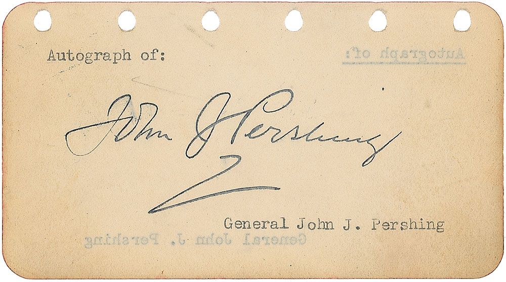 Vintage fountain pen signature, “John J. Pershing,” on an off-white 4.5 x 2.5 page. Moderate edge toning and slight brushing to signature, otherwise fine condition.