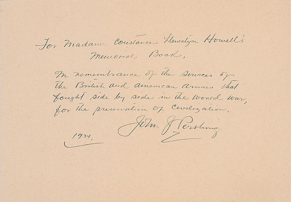 Extraordinary AQS on an off-white 10 x 7 card, signed “John J. Pershing, 1934.” A great sentiment penned “For Madame Constance Llewetyn Howell’s Memorial Book.” In full: “In remembrance of the services of the British and American armies that fought side by side in the World War, for the preservation of civilization.” In very fine condition. A great, one-of-a-kind quote by the WWI commander.