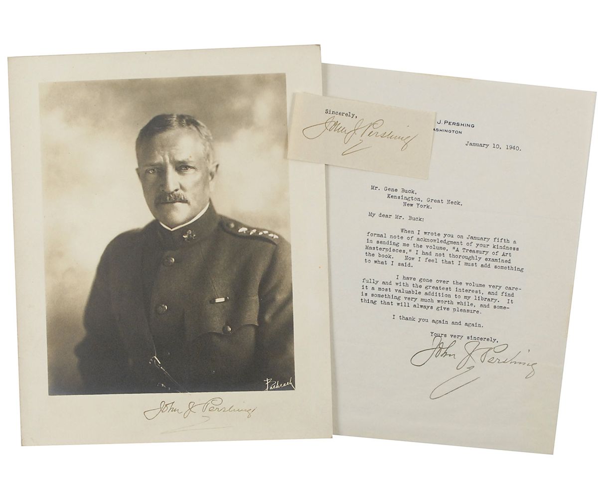Three items: a matte-finish 8 x 10 photo of Pershing in military uniform, signed in the lower border in black ink; a 1940 TLS on personal letterhead, thanking a gentleman for a book entitled A Treasury of Art Masterpieces; and an ink signature on an off-white slip. In overall fine condition.