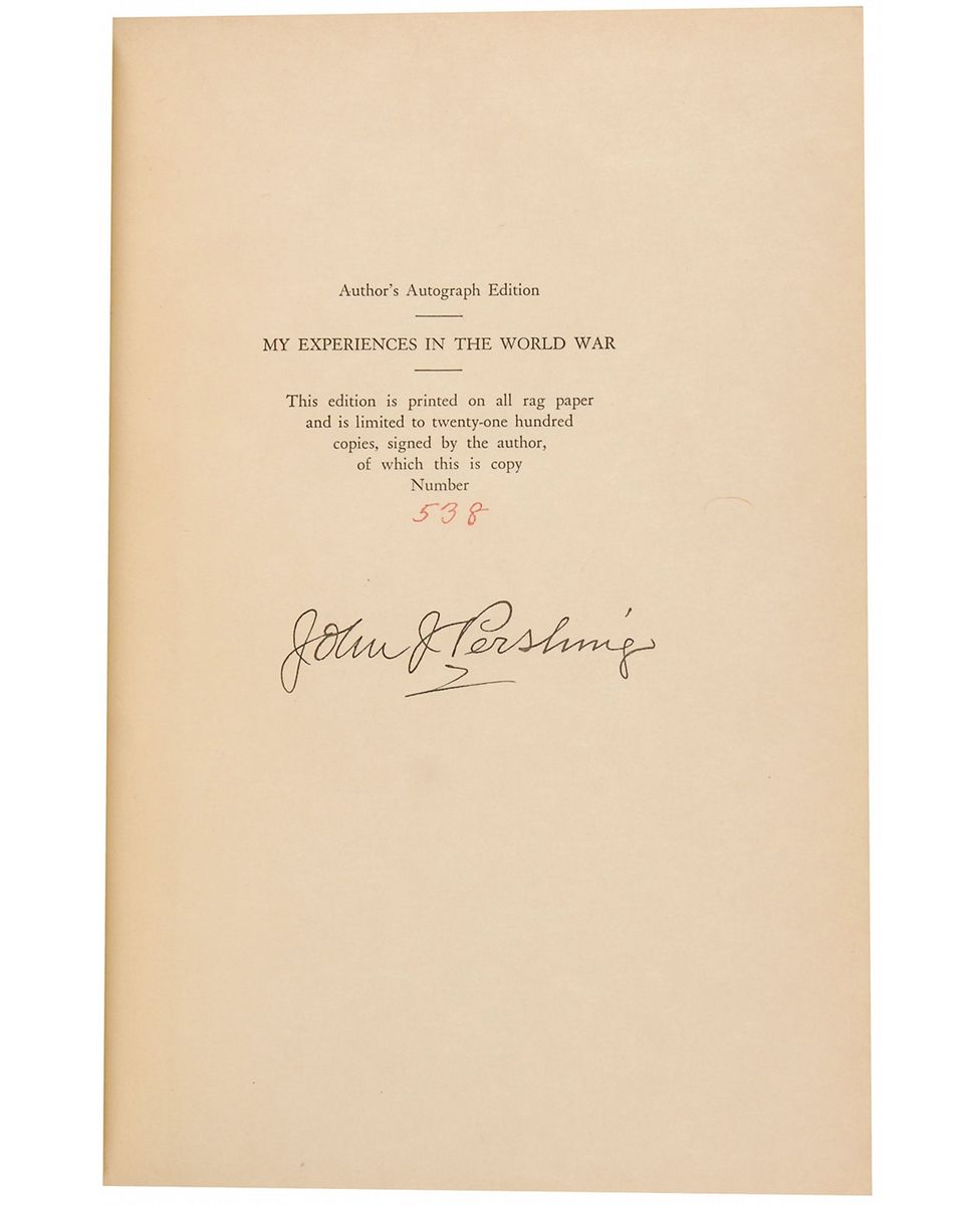 Signed book: My Experiences in the World War, Volume I. Limited author’s autograph edition, numbered 538/2100. NY: Frederick A. Stokes Company, 1931. Hardcover, 6.5 x 9.5, 400 pages. Crisply signed on the colophon in black ink. In fine condition.