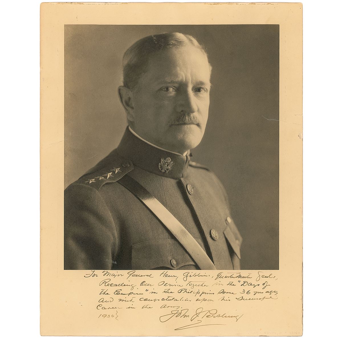 Exceptional matte-finish 10.75 x 13.75 portrait of Pershing in his four-star uniform, signed and inscribed in the lower border in fountain pen, “For Major General Henry Gibbin, Quartermaster Genl, Recalling our service together in the ‘Days of the Empire’ in the Philippines some 36 years ago, and with congratulations upon his successful career in the Army. John J. Pershing, 1936.” Blindstamped in the lower right by the Signal Corps, US Army. In very good condition, with scattered creases, uniformly trimmed edges, and some chipping and soiling to edges, none of these drastically detracting from the fine visual appeal of the piece. Major General Henry Gibbins joined the Third Tennessee Infantry, US Volunteers, in 1898 before going on to serve in the Philippines with the Ninth Cavalry. Pershing was one of the commanders in the Philippine–American War and led efforts to suppress the Filipino Insurrection and served with both the First and Fifteenth Cavalry Regiments. A terrific association with a crystal-clear image.