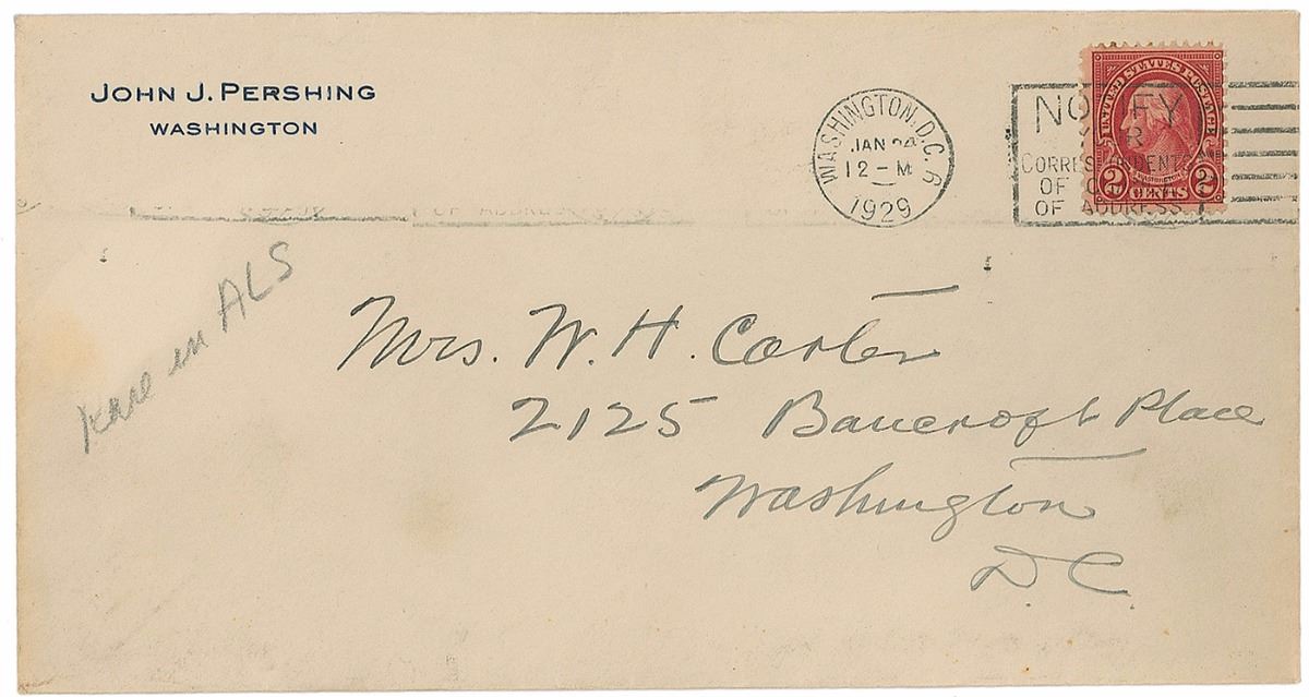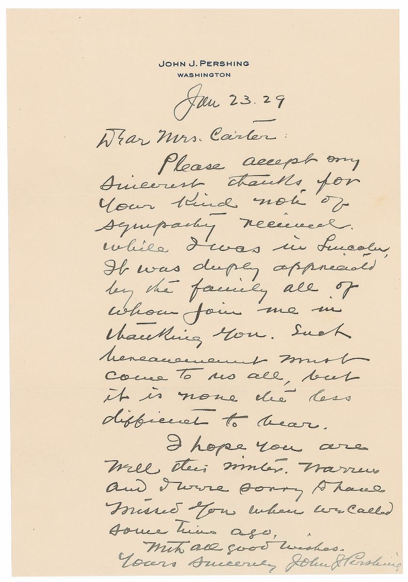 ALS, one page, 7.25 x 10.5, personal letterhead, January 23, 1929. Letter to Mrs. W. H. Carter, in part: “Please accept my sincerest thanks for your kind note of sympathy received while I was in Lincoln. It was deeply appreciated by the family all of whom join me in thanking you. Such bereavement must come to us all, but it is none the less difficult to bear.” In fine condition, with the signature a shade light. Accompanied by the original mailing envelope, addressed in Pershing’s own hand.