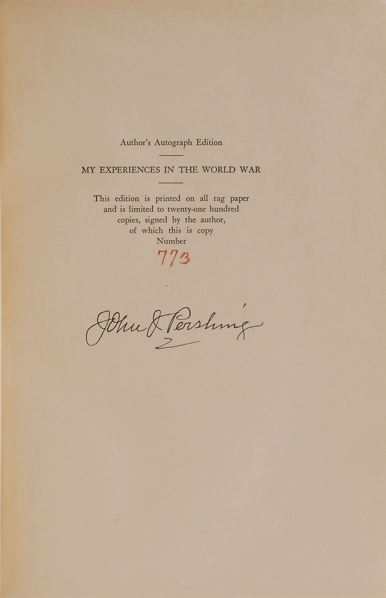 Signed book: My Experiences in the World War. Two volume author’s autograph edition, numbered 773/2100. NY: Frederick A. Stokes Company, 1931. Hardcover, 6.75 x 9.5, 836 total pages. Signed on the colophon on the first volume in black ink. Autographic condition: fine. Book condition: VG-/None.