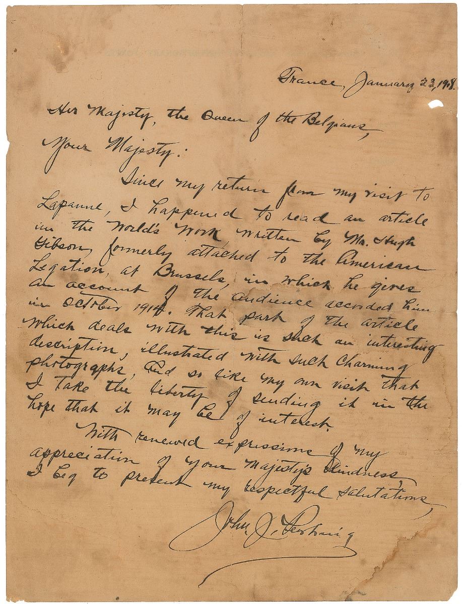 ALS, one page, 8 x 10.5, on the reverse of Headquarters American Expeditionary Forces letterhead, January 23, 1918. Letter to the Queen of Belgium, in full: “Since my return from my visit to Lapanne, I happened to read an article in the World’s Work written by Mr. Stugh Gibson, formerly attached to the American Legation at Brussels, in which he gives an account of the audience accorded him in October 1914. That part of the article which deals with this is such an interesting description, illustrated with such charming photographs, and so like my own visit that I take the liberty of sending it in the hope that it may be of interest. With renewed expressions of my appreciation of your Majesty’s kindness I beg to present my respectful salutations.” In very good condition, with splits along folds, a small hole, and scattered overall staining and toning.
