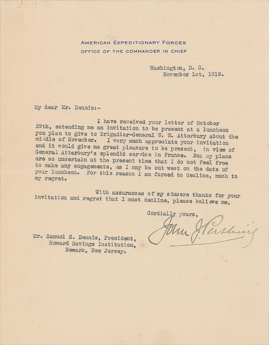 TLS, one page, 7 x 8.75, American Expeditionary Forces, Office of the Commander in Chief letterhead, November 1, 1919. Letter to Samuel S. Dennis, in part: “I very much appreciate your invitation and it would give me great pleasure to be present, in view of General Atterbury’s splendid service in France. But my plans are so uncertain at the present time that I do not feel free to make any engagements, as I may be out west on the date of your luncheon. For this reason I am forced to decline, much to my regret.” In fine condition. Accompanied by a handsome matte-finish 9.75 x 12.5 three-quarter-length portrait of Pershing in uniform, signed along the bottom by the photographer.
