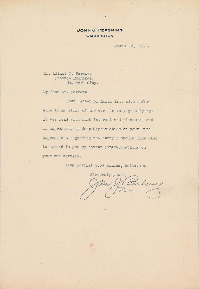 Two TLSs, both signed “John J. Pershing,” addressed to Elliot T. Barrows. The first, General of the Armies letterhead, dated August 12, 1921, in part: “We have not yet made material progress in straightening out the National Guard and Reserve forces, but I believe in a short time will have made considerable progress towards arranging for the more careful selection of officers for duty with these organizations, and also for the special training of these officers before they enter on their new duties”; the second letter, personal letterhead, April 13, 1931, in full: “Your letter of April 1st, with reference to my story of the war, is very gratifying. It was read with much interest and pleasure, and in expressing my deep appreciation of your kind expressions regarding the story I should like also to extend to you my hearty congratulations on your own services.” In overall fine condition, with a rusty paperclip impression and blot to the signature of the earlier letter.