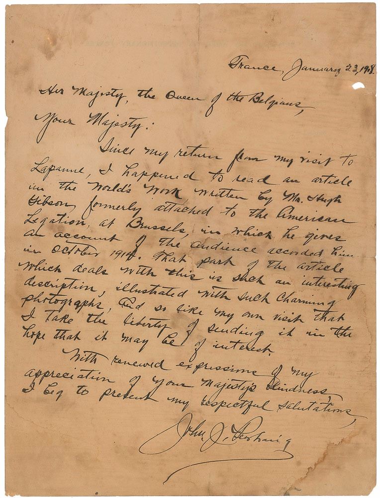ALS, one page, 8 x 10.5, on the reverse of Headquarters American Expeditionary Forces letterhead, January 23, 1918. Letter to the Queen of Belgium, in full: "Since my return from my visit to Lapanne, I happened to read an article in the World's Work written by Mr. Stugh Gibson, formerly attached to the American Legation at Brussels, in which he gives an account of the audience accorded him in October 1914. That part of the article which deals with this is such an interesting description, illustrated with such charming photographs, and so like my own visit that I take the liberty of sending it in the hope that it may be of interest. With renewed expressions of my appreciation of your Majesty's kindness I beg to present my respectful salutations." In very good condition, with splits along folds, a small hole, and scattered overall staining and toning.