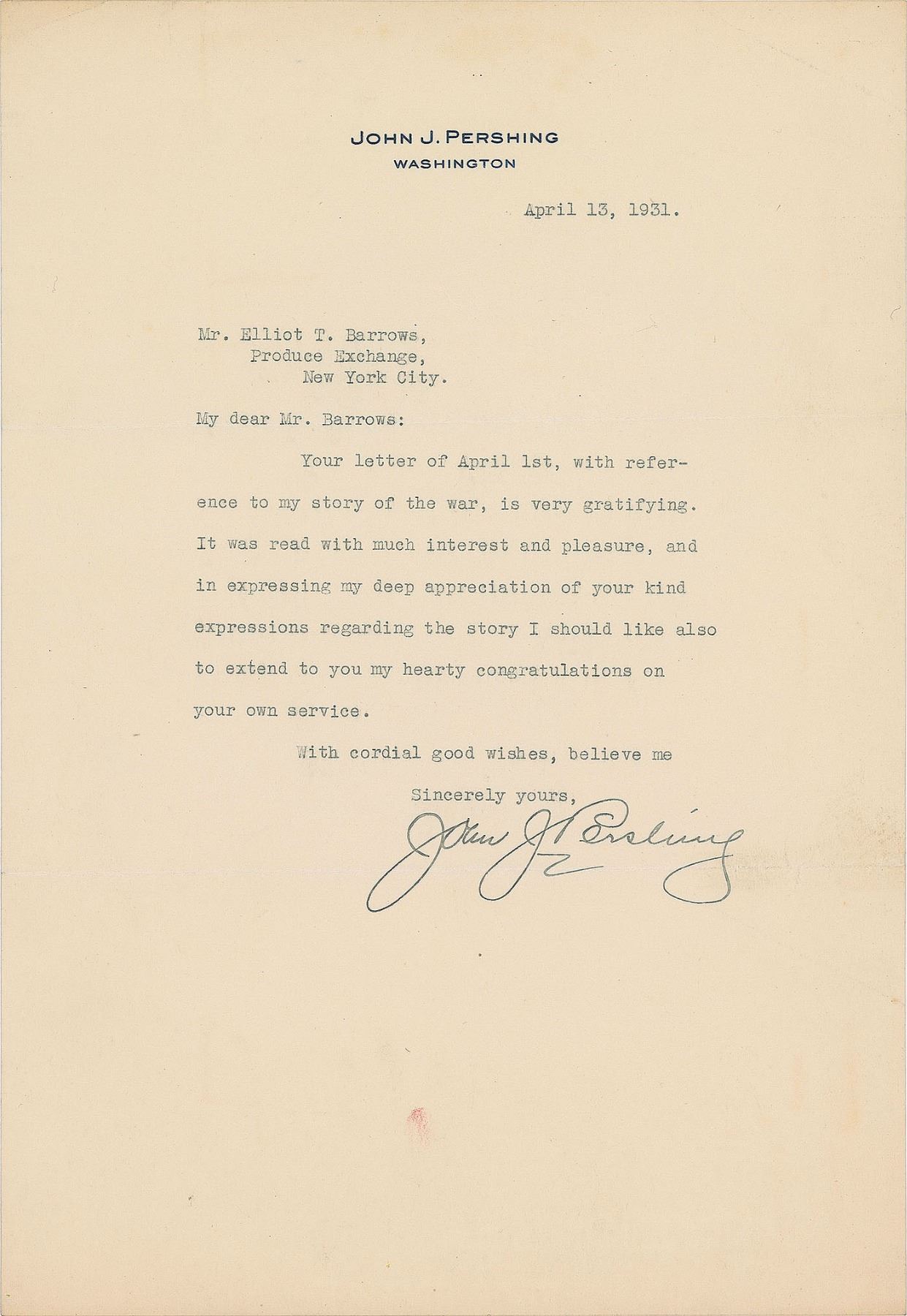 Two TLSs, both signed "John J. Pershing," addressed to Elliot T. Barrows. The first, General of the Armies letterhead, dated August 12, 1921, in part: "We have not yet made material progress in straightening out the National Guard and Reserve forces, but I believe in a short time will have made considerable progress towards arranging for the more careful selection of officers for duty with these organizations, and also for the special training of these officers before they enter on their new duties"; the second letter, personal letterhead, April 13, 1931, in full: "Your letter of April 1st, with reference to my story of the war, is very gratifying. It was read with much interest and pleasure, and in expressing my deep appreciation of your kind expressions regarding the story I should like also to extend to you my hearty congratulations on your own services." In overall fine condition, with a rusty paperclip impression and blot to the signature of the earlier letter.