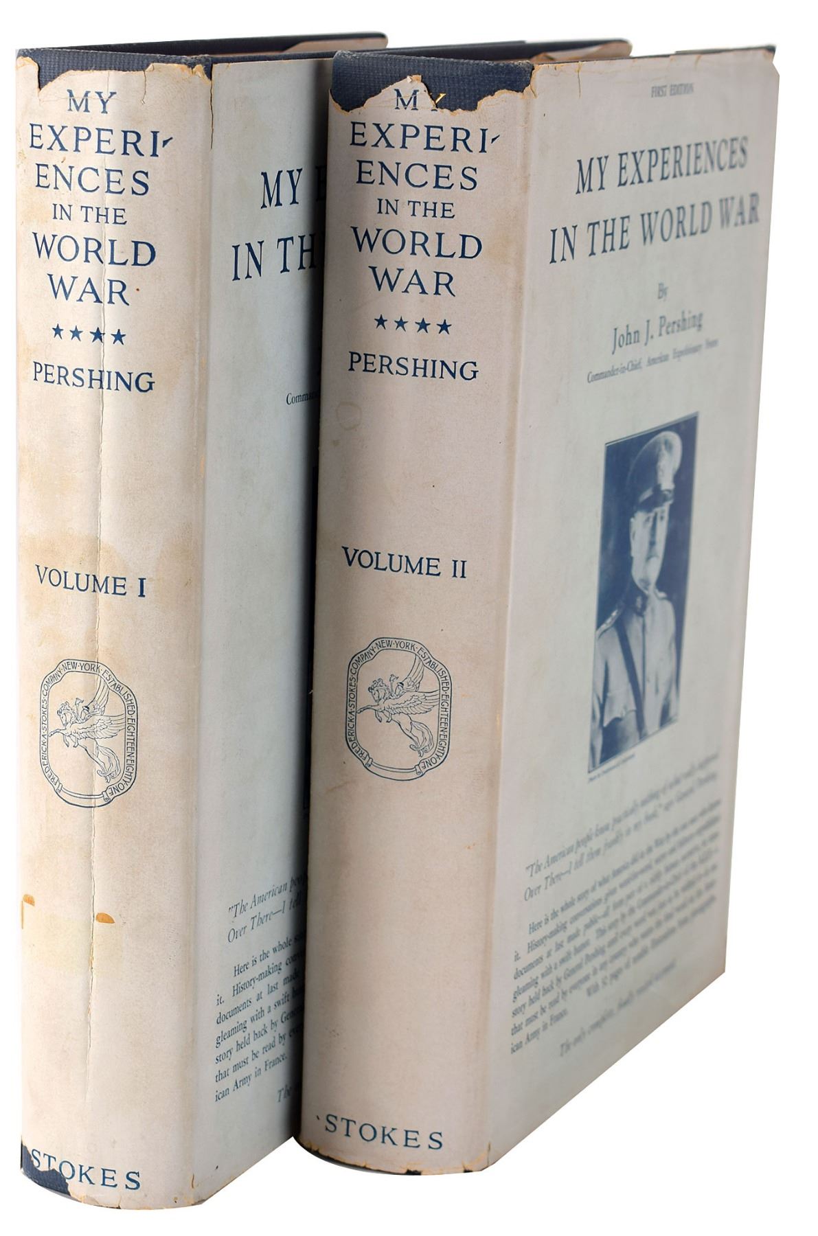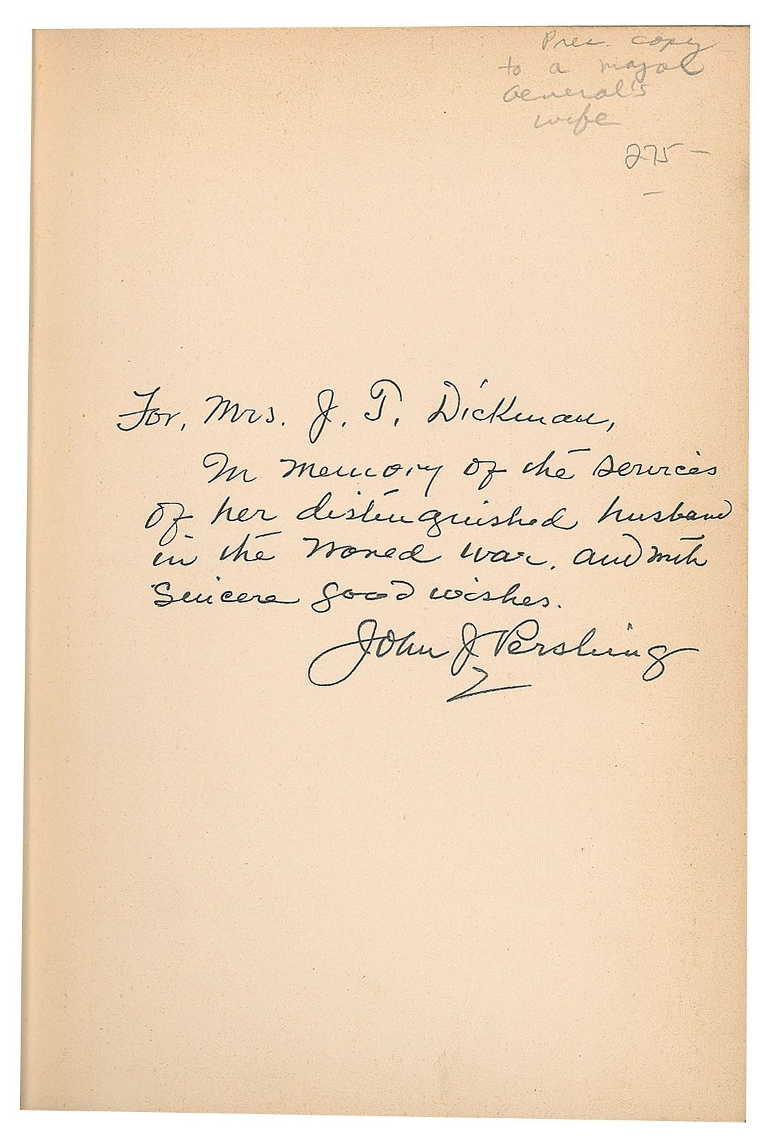 Signed book: My Experiences in the World War, Vols. 1 and 2. First edition. NY: Frederick A. Stokes, 1931. Hardcover with dust jacket, 6.75 x 9.5, 400 pages. Signed and inscribed on the first free end page of the first volume in fountain pen, "For Mrs. J. T. Dickman, In memory of the services of her distinguished husband in the World War, and with sincere good wishes, John J. Pershing." In overall very good to fine condition, with wear and chipping to the price-clipped dust jackets.