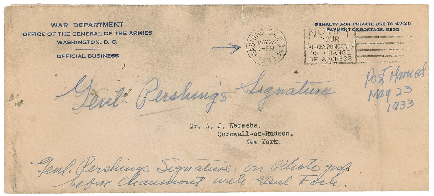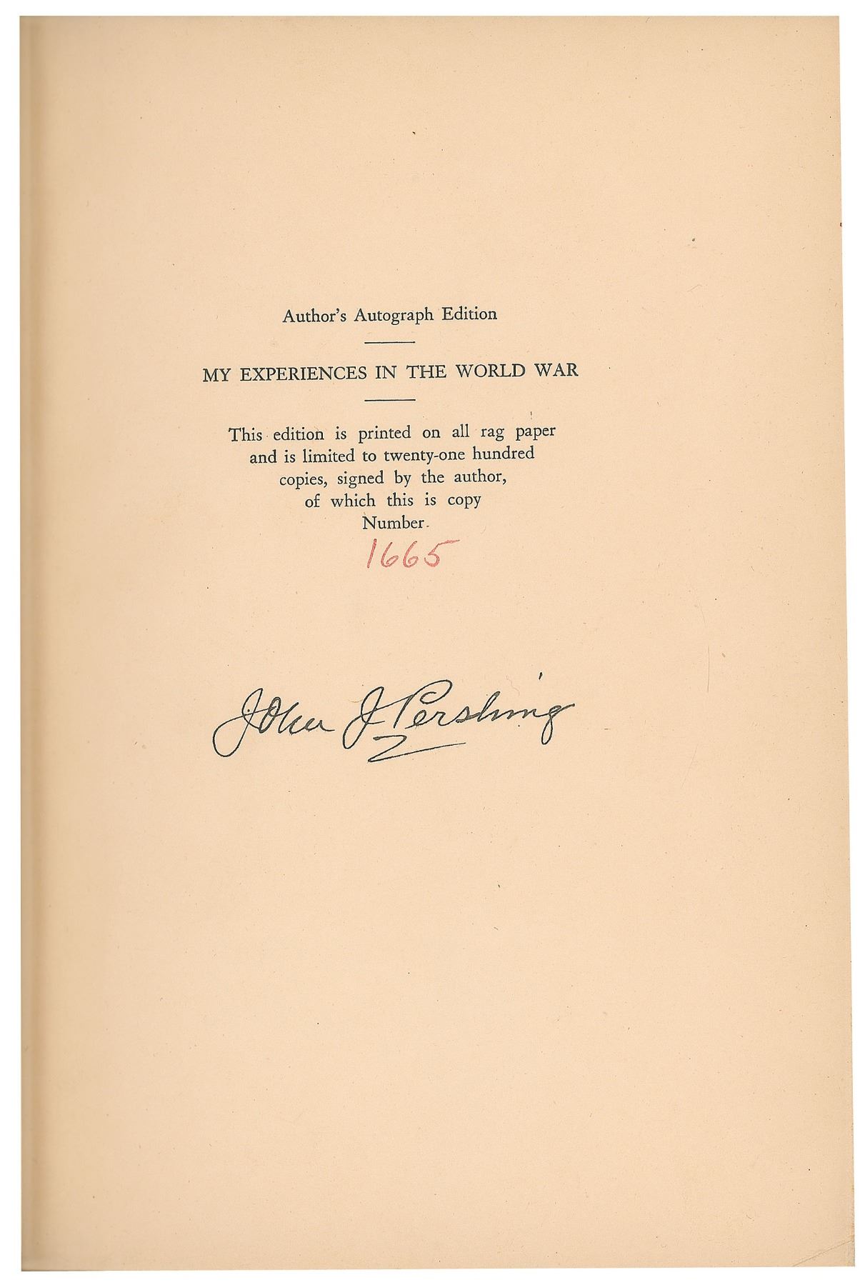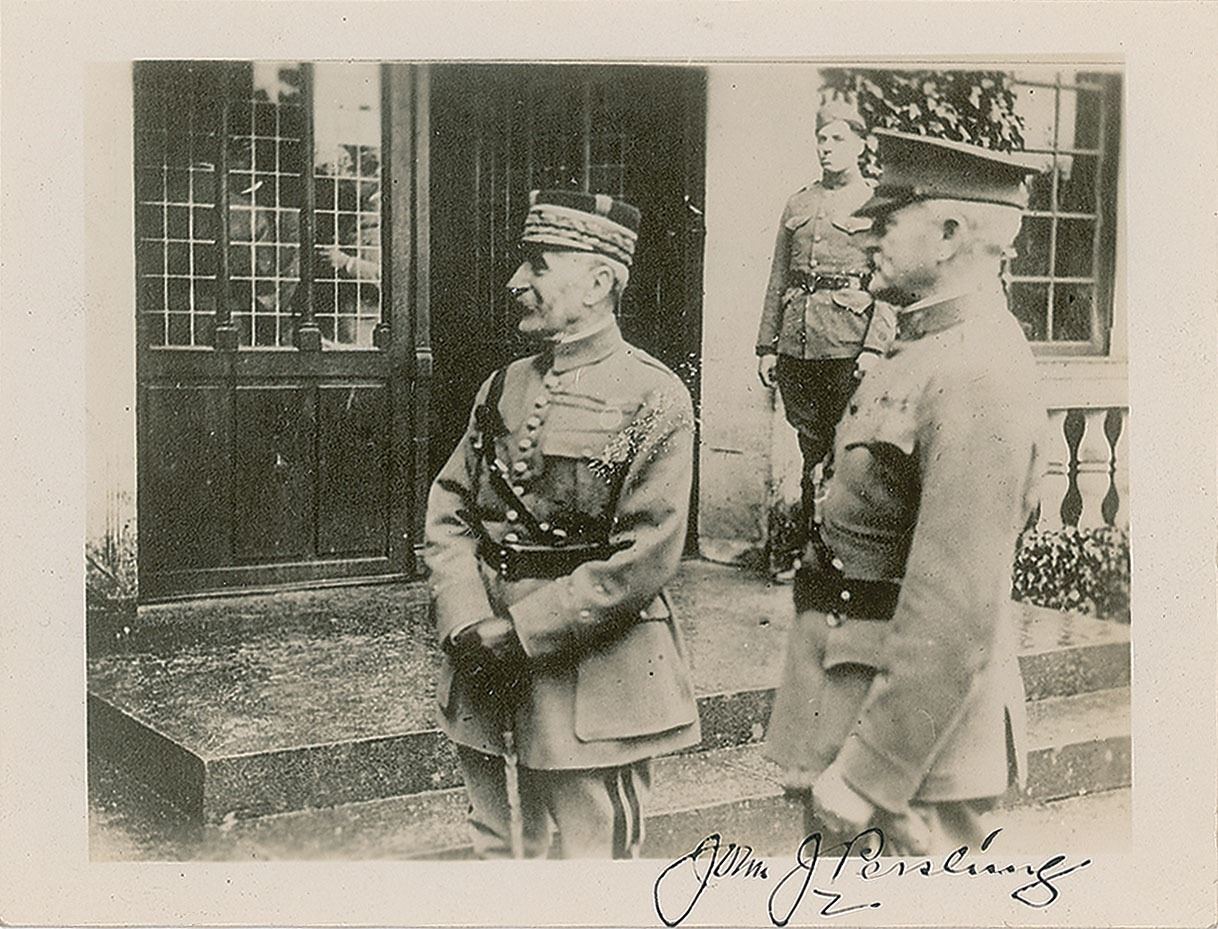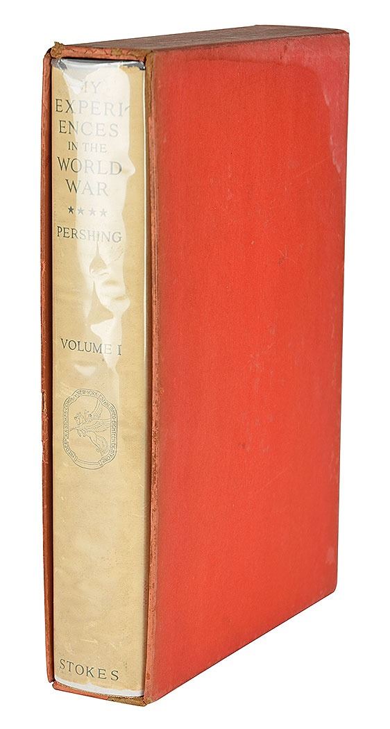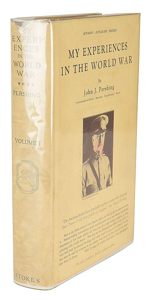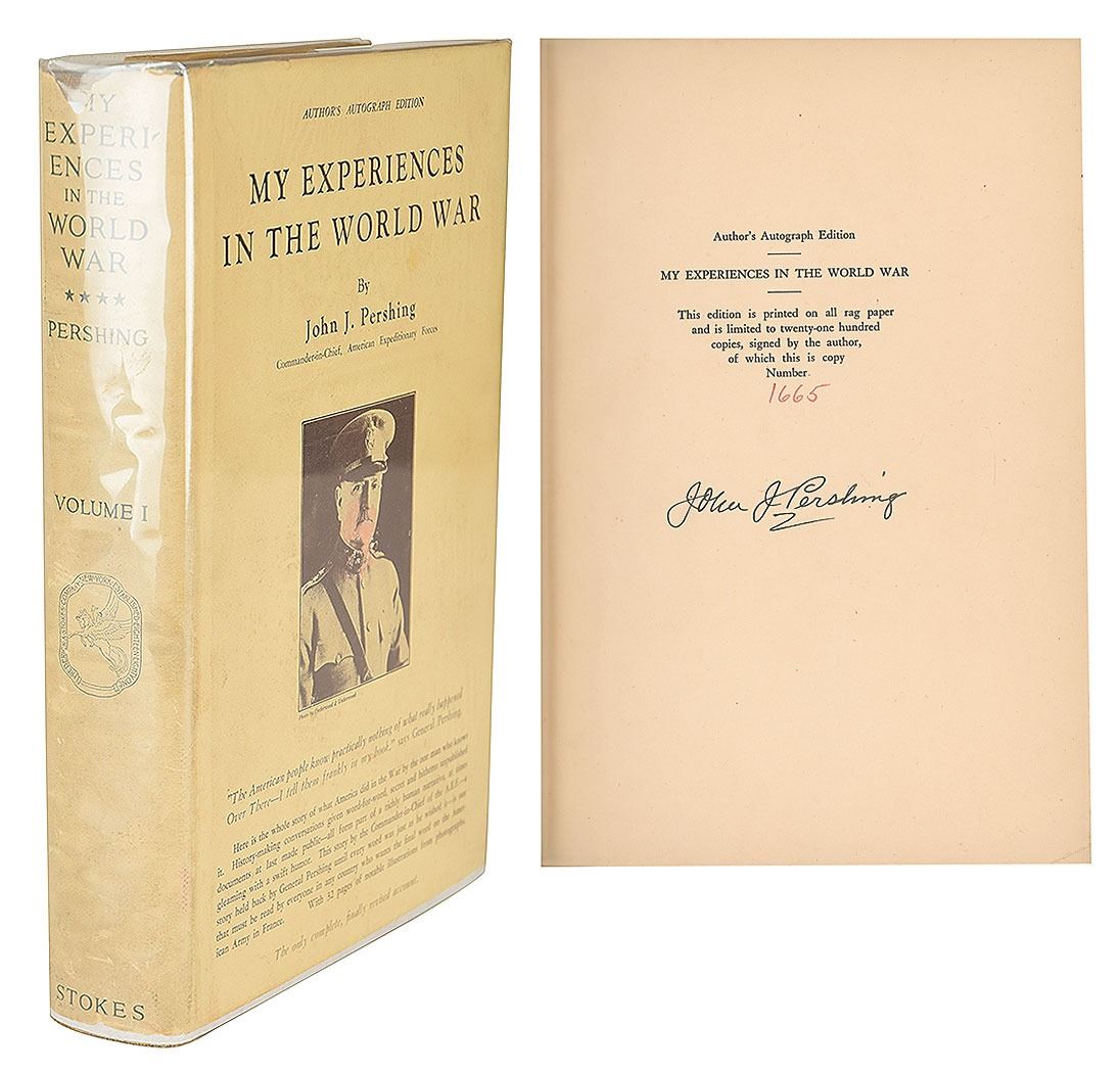Two items: an 'Author's Autograph Edition' of My Experiences in the World War, hardcover with slipcase, numbered 1665/2100, signed on the colophon in fountain pen by Pershing; and a vintage glossy 4.75 x 3.75 photo of Pershing and Marshall Foch, signed in the lower border in fountain pen by Pershing. In overall very good to fine condition, with soiling, wrinkling, and chipping to the book's dust jacket, and staining and toning to its slipcase; the photo has a few light creases and impressions from a collector's notation on the reverse. Accompanied by the original mailing envelope for the photograph, postmarked May 23, 1933.