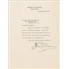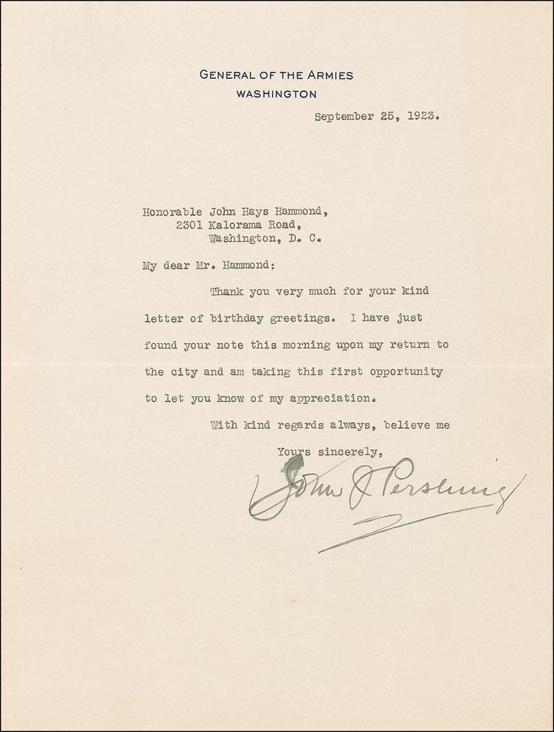 TLS, one page, 7 x 9.25, General of the Armies letterhead, September 25, 1923. Letter of thanks to John Hays Hammond. In full: “Thank you very much for your kind letter of birthday greetings. I have just found your note this morning upon my return to the city and am taking this first opportunity to let you know of my appreciation.” In fine condition, with a few light wrinkles and an ink blotch to first letter of signature.