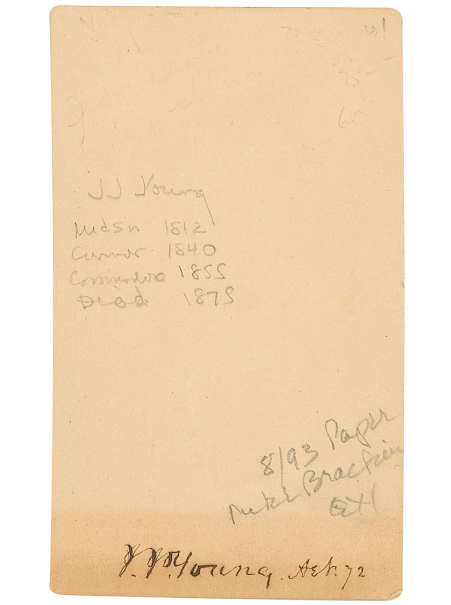 US naval officer from New York. Original 2.25 x 4 carte-de-visite photo by Porcook, signed on the reverse in black ink, “J. J. Young, Aet. 72.” Uniform toning over signature and some pencil notations to reverse, otherwise fine condition.