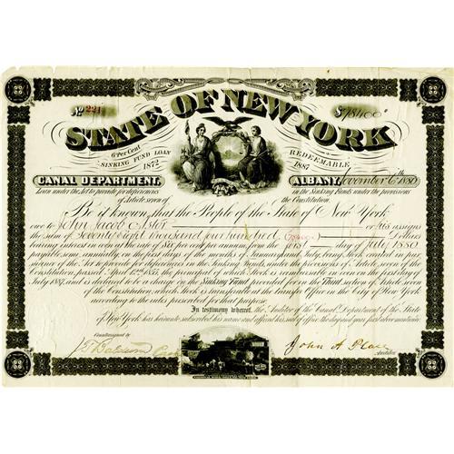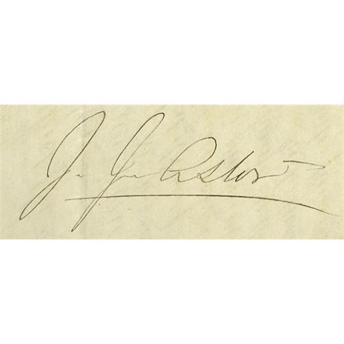<B>John Jacob Astor III (1822-1890) Document Signed</B></I> "<I>J.J. Astor.</B></I>" One page, 12" x 8.5", Canal Department, Albany, New York, November 6, 1880. This stock certificate comes from the State of New York, Canal Department in Albany and is filled out to John Jacob Astor. Astor signs the verso in bold, dark ink. Astor would only have been 16 when this stock was issued; this shows how he was involved in money and finance even at an early age. Known by most as John Jacob Astor IV, he was the Astor who served as a lieutenant colonel in the Spanish-American war and made his money in real estate, including the Waldorf-Astoria Hotel. Astor was killed along with 1500 others when the <I>Titanic</B></I> struck and iceberg and sank in 1912. Many stories circulate about Astor's heroics that night when the boat sank, including one in which he places a woman's hat on a boy to ensure that he got off the boat safely. <BR><BR>The document is in fine condition; the usual folds are present; the paper is brittle and separating; small hole present in the center of the value of the stock certificate.
