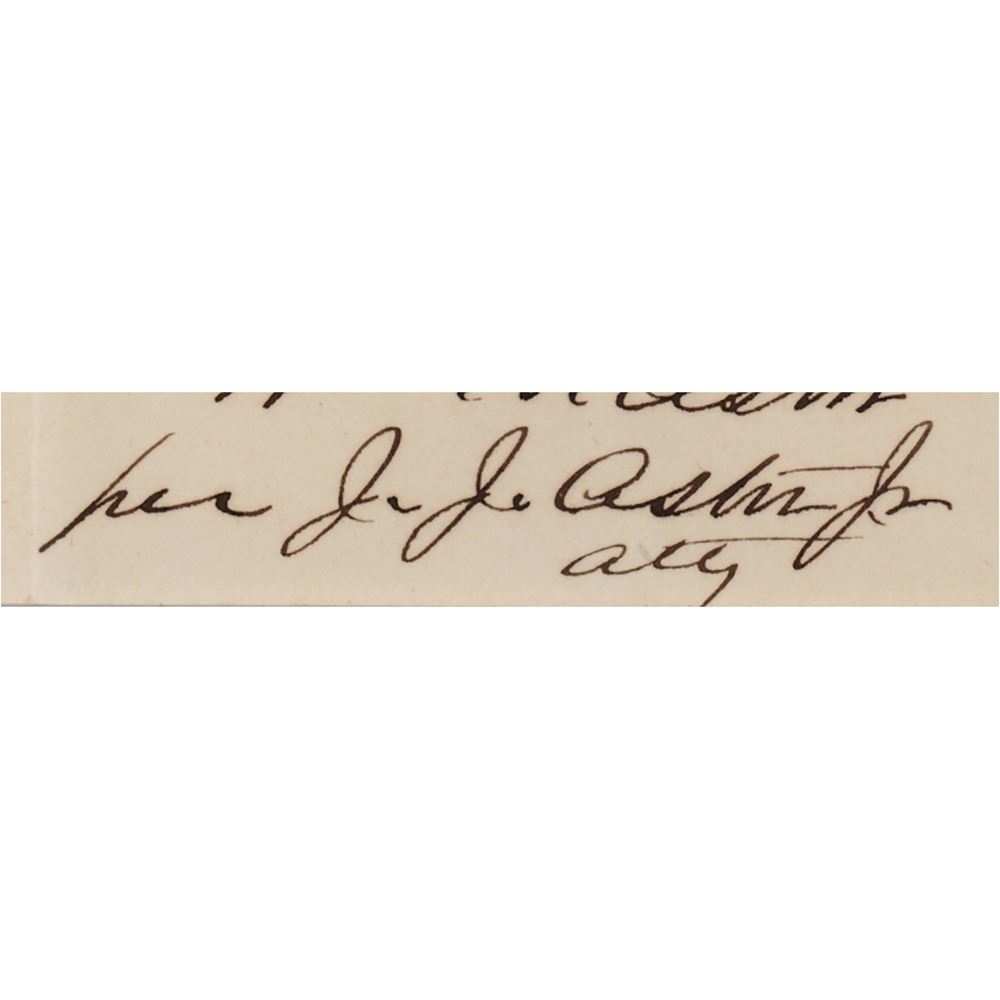 ALS signed on behalf of his father, “Wm. B. Astor per J. J. Astor, Jr., atty,†one page, 4 x 6, March 22, 1867. Handwritten letter to the treasurer of the Morris & Essex Rail Road Co., in part: "I am in receipt of your letter of the 21st Inst., enclosing certificate of stock of your company for 166 shs and scrip for $30. being amount of my Dividends." In fine condition.