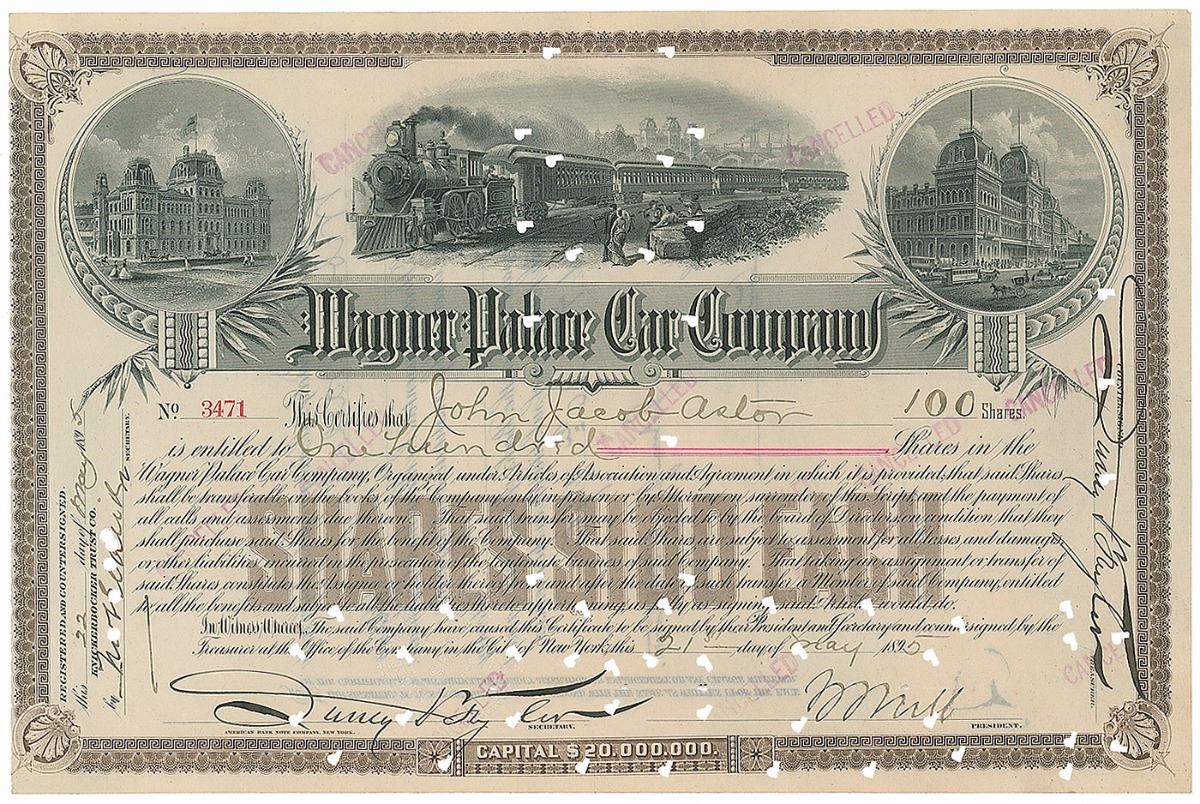 Real estate magnate, military officer, and heir to the Astor fortune (1864-1912) who perished in the Titanic disaster. Partly-printed DS, signed “John Jacob Astor,” one page, 12 x 8, May 21, 1895. Engraved certificate for 100 shares in the Wagner Palace Car Company issued to John Jacob Astor. Signed on the reverse by Astor, and signed on the front by William Seward Webb as president. In fine condition. From 1894 to 1896, Astor served as a colonel on the military staff of New York Governor Levi P. Morton.