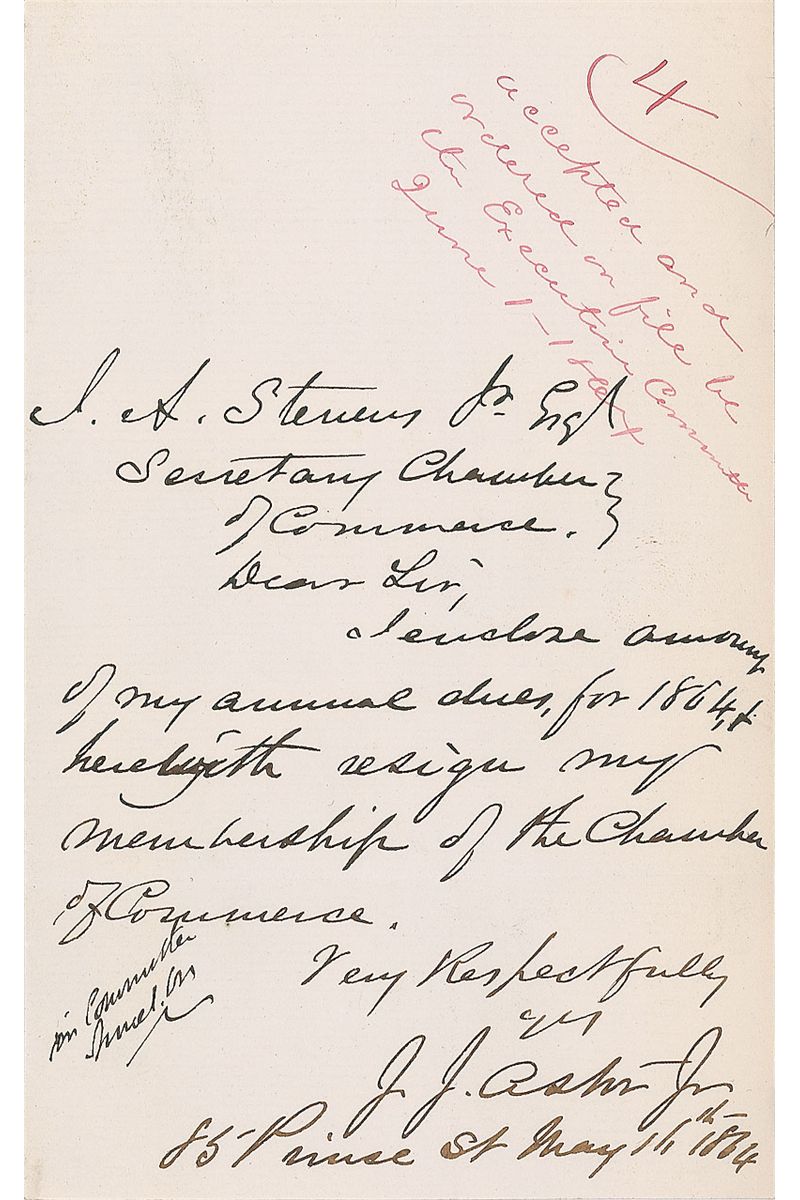 Eldest son of millionaire John Jacob Astor. ALS signed “J. J. Astor, Jr.,” one page, 4 x 6.25, May 11, 1864. Brief letter to the secretary of a Chamber of Commerce. In full, “I enclose amount of my annual dues for 1864, & herewith resign my membership of the Chamber of Commerce.” In fine condition, with red ink notation to top right and intersecting folds, one through a single letter of signature.