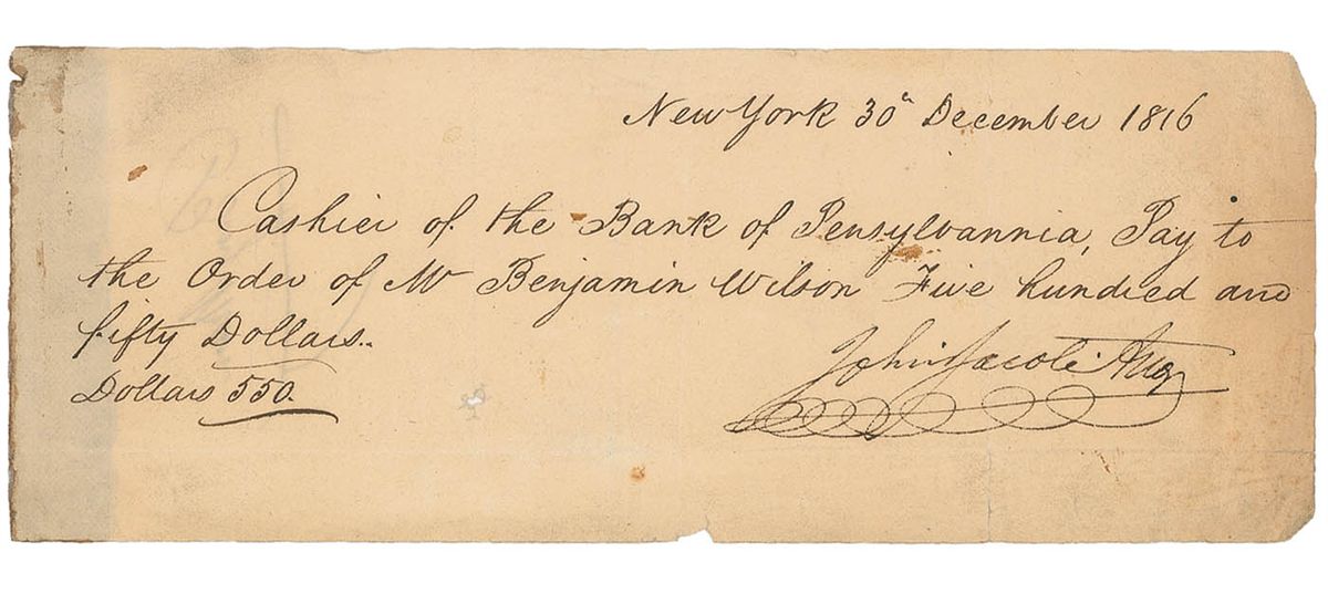 Patriarch of the fabled Astor family (1763–1848) of American businessmen, who, through lucrative dealings in fur, real estate, and opium, became the first millionaire in the United States. Manuscript check, 8 x 3, written out in another hand, and reading “Cashier of the Bank of Philadelphia Pay to the order of W. Benjamin Wilson Five hundred and fifty dollars,” signed by Astor and dated December 30, 1816. Vertical folds, a few through signature, scattered creases, a few edge tears and chips, and some scattered light toning and soiling, otherwise very good condition.