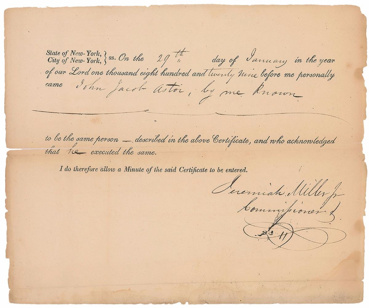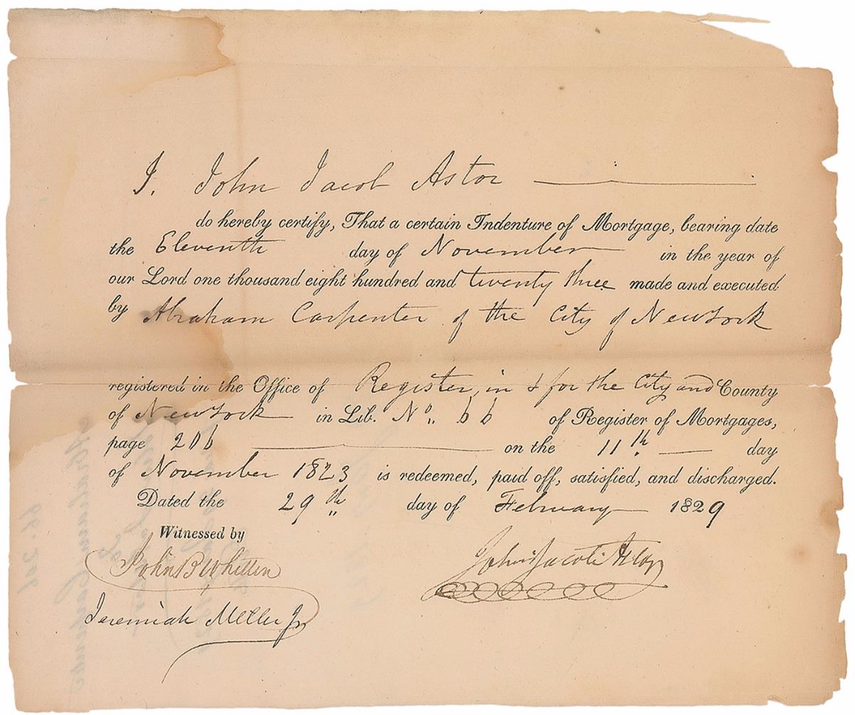Businessman who was the first prominent member of the Astor family and the first multimillionaire in the United States (1763–1848). Partly-printed DS, one page, 8.25 x 6.75, February 29, 1829. Document certifying that an indenture of mortgage made and executed by Abraham Carpenter is “redeemed, paid off, satisfied, and discharged.” Signed at the conclusion by Astor and countersigned by two witnesses. Accompanied by a related partly-printed document signed by a city official. In very good condition, with a tape-repaired complete separation to the central horizontal fold, dampstaining to left side affecting some text in the body, and chipping to edges.