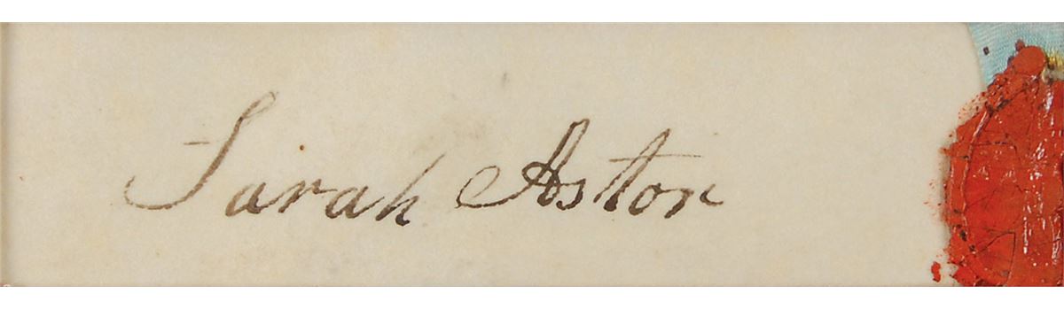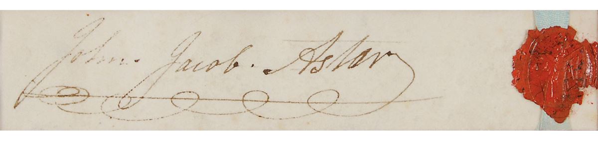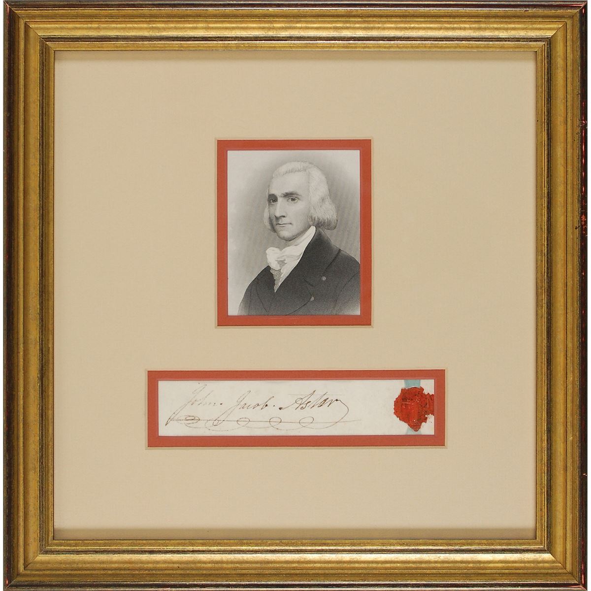 Business magnate and merchant (1763–1848) who became the first multimillionaire in the United States; Sarah was his only wife, with their nearly 50-year-long marriage ending upon her 1834 passing. Ink signatures, “John Jacob Astor” and “Sarah Astor,” presumably on a pair of off-white 6.25 x 1.5 vellum slips clipped from a document, with a window on the reverse for viewing Sarah’s signature on opposing side. Both documents retain original light blue ribbons and red seals affixed to the right of signatures. Double-matted and framed with a head-and-shoulders portrait of the prominent fur-trader and investor to an overall size of 13.5 x 13.5. In overall fine condition, with some irregular ink adhesion to John’s first name.