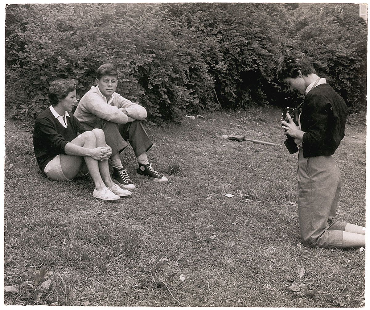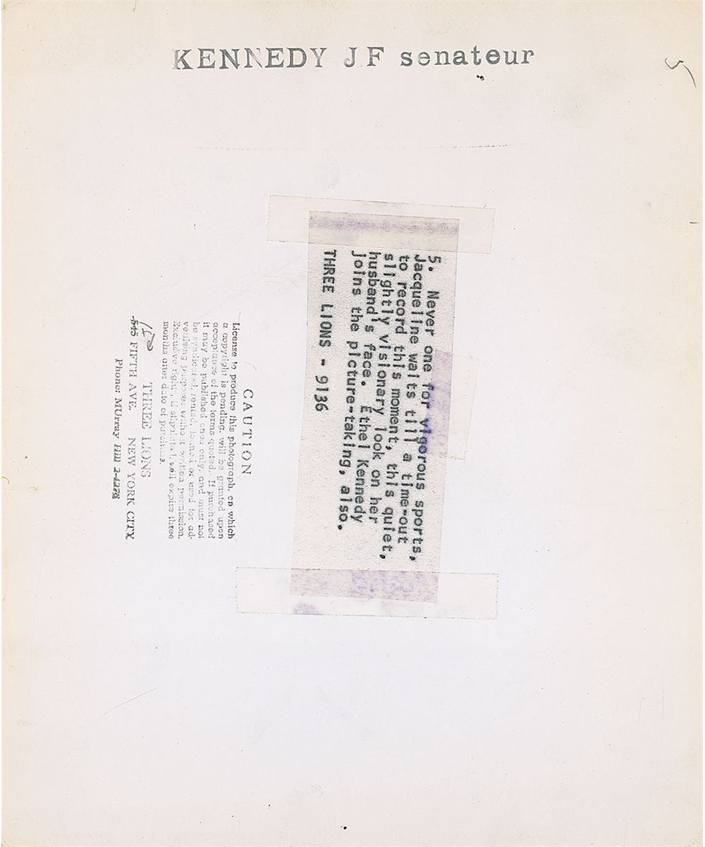 Original first-generation 9.25 x 7.75 glossy photo of Jackie taking a photograph of John Kennedy and his sister-in-law Ethel. Reverse of photo bears a Three Lions Inc. stamp and an affixed caption. Slightly trimmed edges and some scattered creases, otherwise fine condition. Having worked as a photographer for the Washington Times-Herald before marrying John, Jackie was quick to grab Suero’s Roloflex camera and take a few shots of her own. Lucky to have his spare camera with him, Suero captured some excellent images of Jackie at work, including this adorable photo of Ethel and John taking a break.