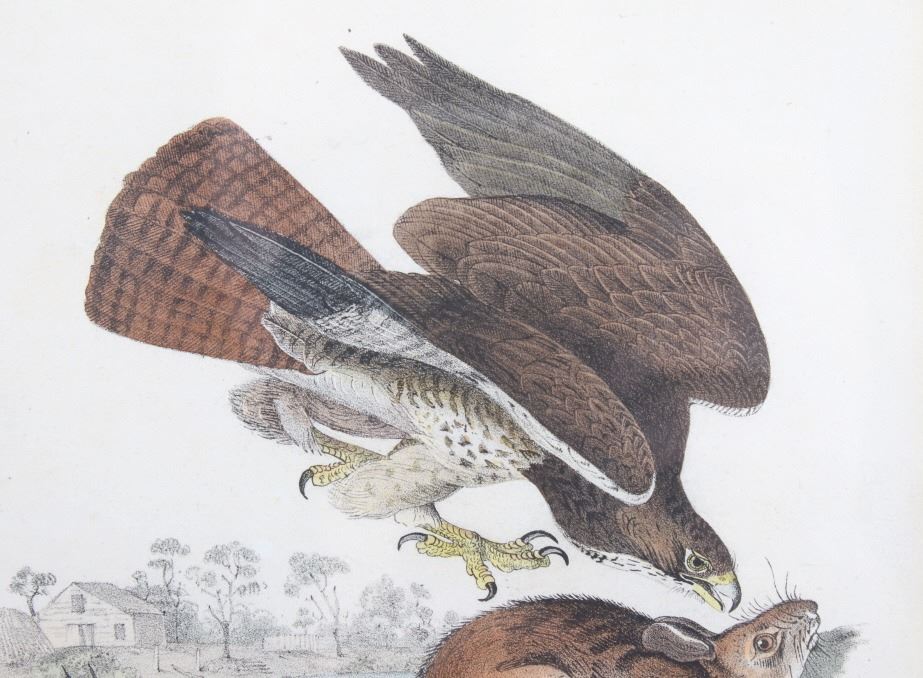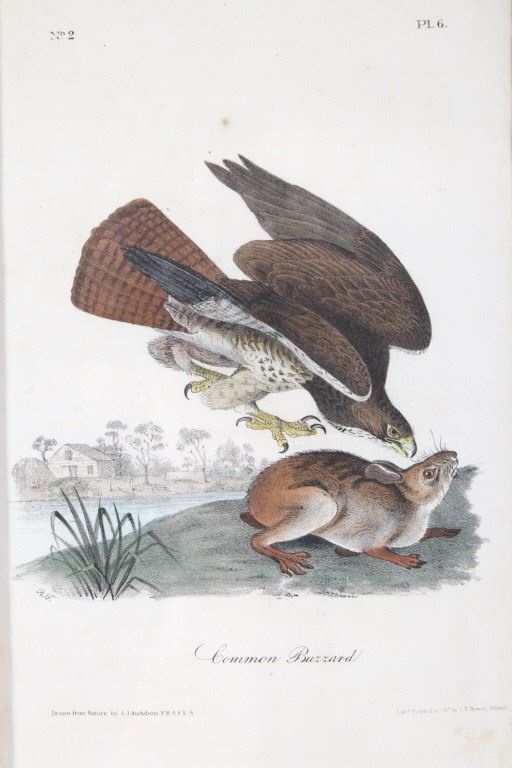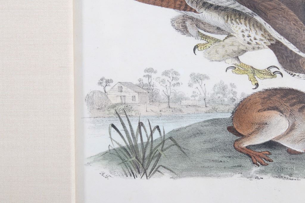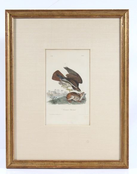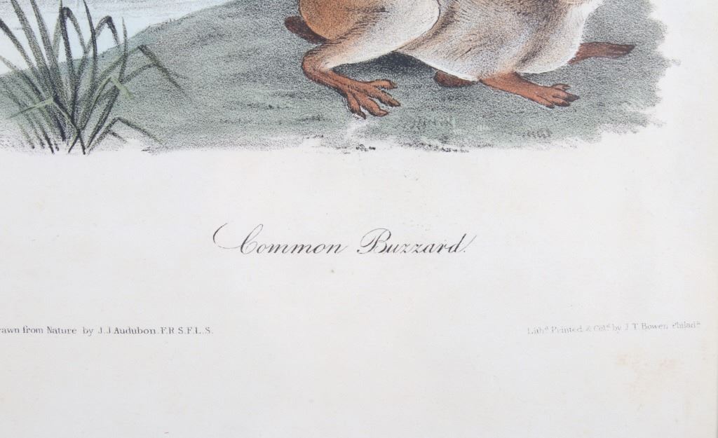 Included in this lot we have a framed John James Audubon lithograph titled "Common Buzzard" originating from the early to mid 19th century. John James Audubon (1785-1851) was an American artist, Naturalist, and ornothologist. He is best known for his book "The Birds of America" in which he found and painted life sized paintings of over 700 different species of bird found in North America and discovered 25 new species and 12 sub species in the process. This piece features a common buzzard as it swoops down to grab a rabbit. The art shows excellent attention to detail and wonderful coloration. The lithograph is marked "No. 2 PL. 6" across the top indicating it is number two from plate six. It is marked across the bottom reading "Common Buzzard - Drawn from Nature by J.J. Audubon. F.R.S.F.L.S. - Lith.d Printed & Col.d by J.T. Bowen Philad.a". The art is set into a custom gilt gold painted frame with a tan border around the lithograph. The back of the frame is marked with two different art gallery tags one from Texas and one from Sundog Fine Art Gallery in Bozeman. Provenance: From the renowned Sundog Fine Art Bozeman, Montana collection and collected by Bruce VanLandingham. Bruce VanLandingham was a pillar in the American Indian collecting community and a respected expert. Along with being an avid collector Bruce also was the sole owner of Sundog Fine Art Gallery in Bozeman which was both part museum and gallery. The piece shows good condition with some very light wear on the frame. The frame measures 15 1/4" wide by 19 1/2" tall with the art measuring 9 3/8" tall by 5 5/8" wide.