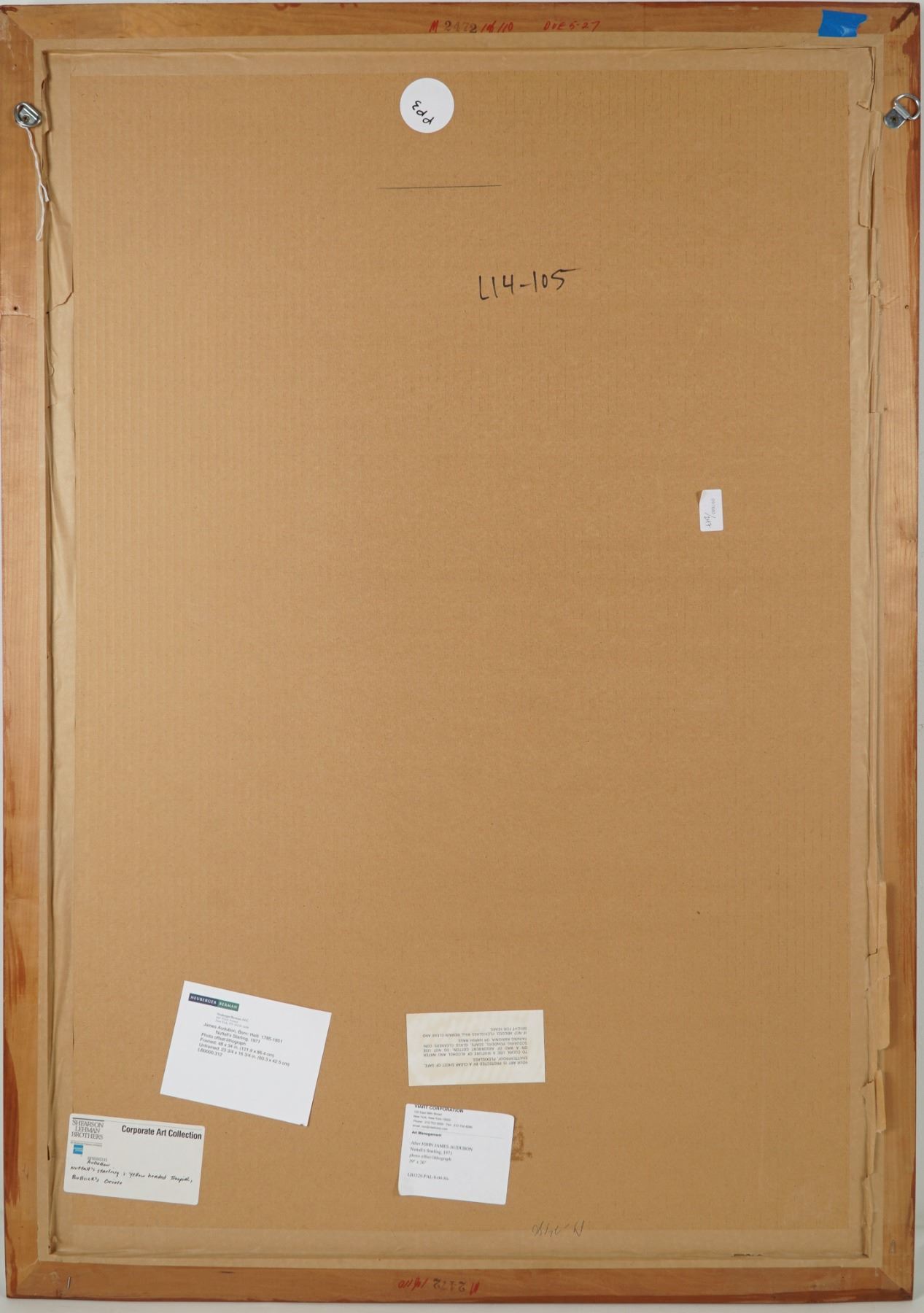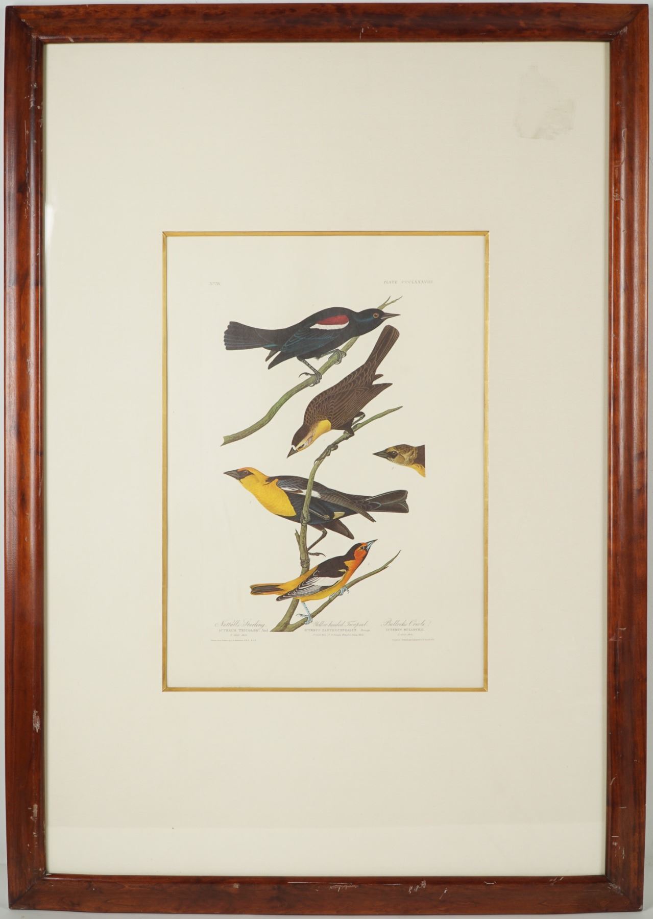 This framed photo offset lithograph from 1971 reproduces Plate CCCLXXXVIII (368) of John James Audubon's iconic Birds of America series. The illustration features a striking vertical composition of five ornithological specimens perched along a slender branch, including the Red-Winged Blackbird, Yellow-Headed Blackbird, and Baltimore Oriole. Finely printed with vivid color accuracy and botanical detail, the reproduction pays homage to Audubon's original 19th-century engraving and watercolor artistry. Published by the Abbeville Press, the print is matted with a gold-bordered window and housed in a walnut-tone wood frame under glass. Labels from a corporate art collection are affixed to the back.