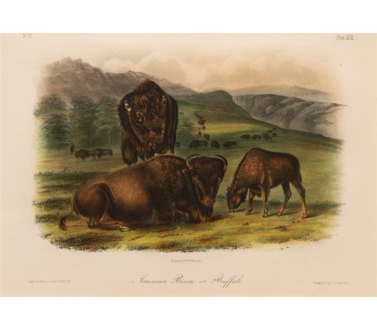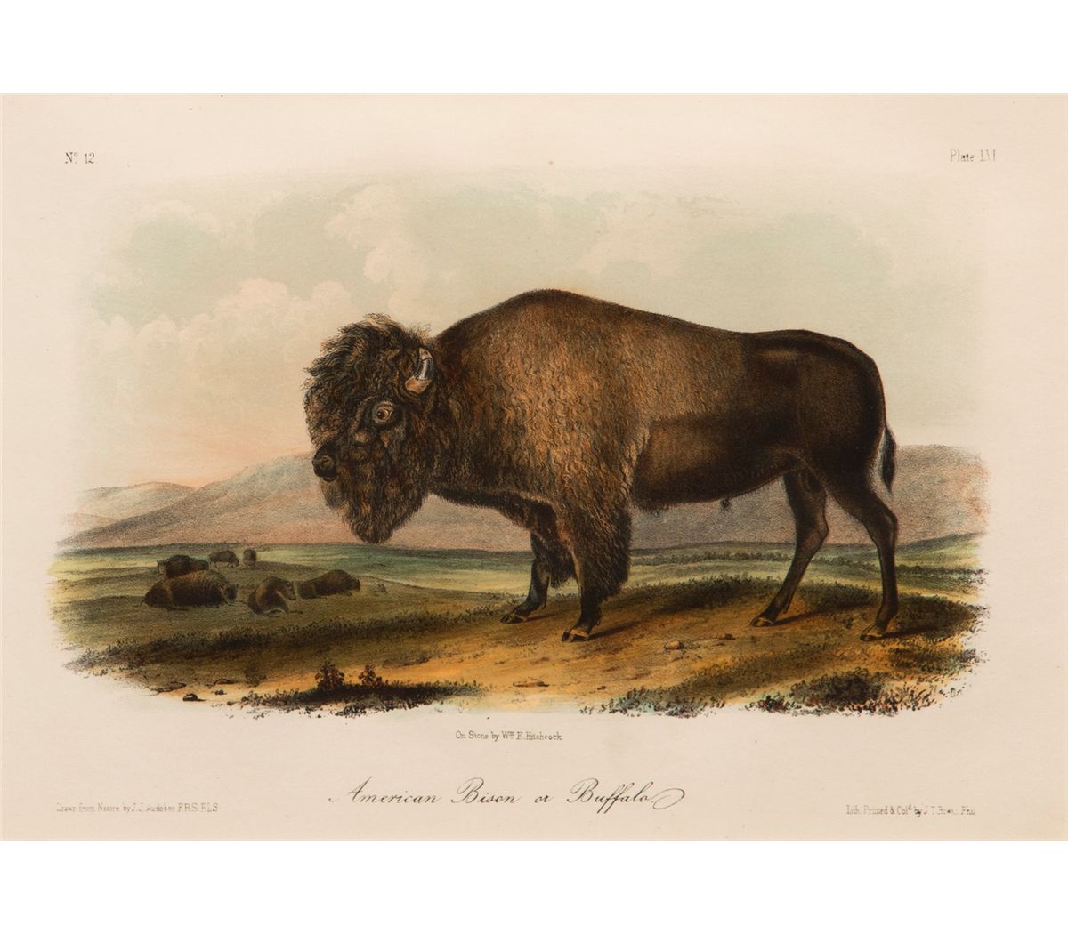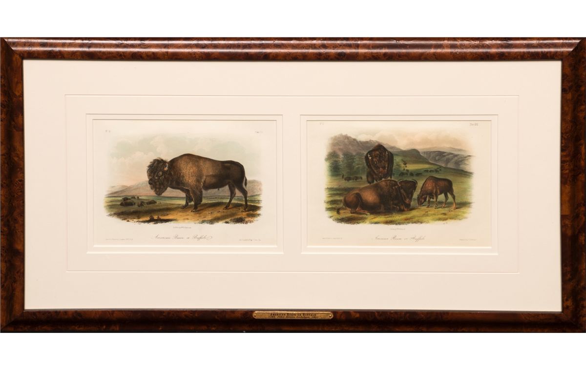 John James Audubon (1785 - 1851). American Bison or Buffalo. Two 7" x 10" octavo lithographs. Plates 56 and 57, framed together. On stone by William E. Hitchcock, Lithography by J. T. Bowen.