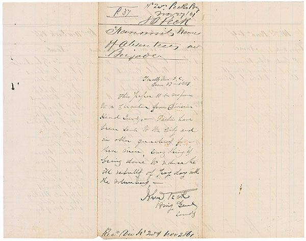 Army general (1821–1878) who served in the Mexican-American War and Civil War. Civil War–dated DS, signed “John J. Peck, Brig. Gen’l Comdg,” one gridded page both sides, 10 x 8, November 27, 1861. Handwritten endorsement on the reverse of a ‘List of Absentees’ missing from duty from three volunteer armies. In full: “This paper is in response to a circular from Division Head Qurs.—Parties have been sent to the city and in other quarters for these men. Every thing is being done to reduce the ill results of pay day with the volunteers.” Two vertical folds, with slight separation to one, and light scattered soiling, otherwise fine condition.