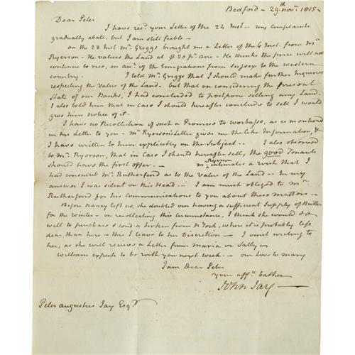 <B>John Jay Autograph Letter Signed In Which He Comments on the Affect of Two Post-War of 1812 Factors, the Explosion of the Westward migration and the Financial Crisis, on New York State Land Prices.</B></I> Jay, John. First Chief Justice of the U. S., President of the Continental Congress, diplomat. Autograph Letter Signed, 1 page 4to, Bedford, N. y., Nov. 29, 1815, to his son, Peter Augustus Jay. The letter concerns the possible sale of some land, mentioning the affect of westward migration and the banking industry on land prices. He also mentions his own health and an estate matter, the butter supply for the winter. The letter reads in part: <I>"...my complaints gradually abate, but I am still feeble..Mr. Griggs brought me a letter of the 6 Inst. from Mr. Ryerson -- He values the land at $20 pr. acre -- He thinks the price will not continue to rise, on acct. of the Emigrations from Sussex to the western country. I told Mr. Griggs that I should make further inquiries respecting the value of the Land -- but that considering the present State of our Banks, I had concluded to postpone selling any land...I think she would do well to purchase & send a firkin [of butter] from N. York, where it is probably less dear than here..."</B></I> The comment about "Emigrations" to the west is particularly interesting because with the end of the War of 1812, there was a dramatic increase in settlement of the eastern Mississippi valley; the population west of the Appalachians doubled by 1820. In expressing his concern about <I>"the present State of our Banks,"</B></I> Jay refers to the postwar financial crisis which led, in early 1816, to the creation of the Second Bank of the United States and the tariff of 1816. John Jay spent his last 28 years in retirement at Bedford, his large estate. Interesting. Fine condition.