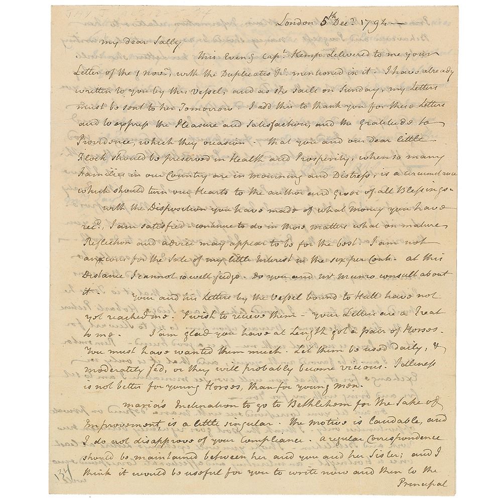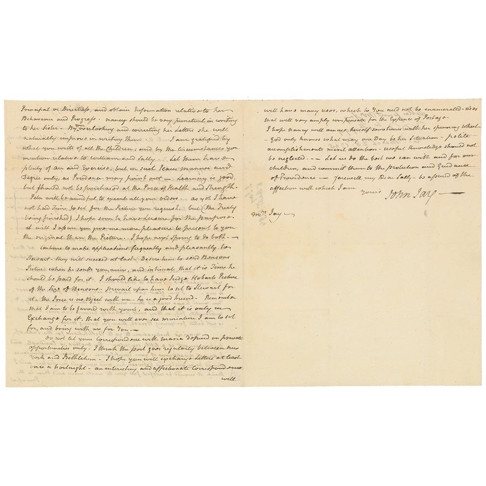 ALS, three pages on two adjoining sheets, 7.25 x 8.5, December 5, 1794. Loving handwritten letter to his wife Sally, written while abroad in London after negotiating the Jay Treaty. In part: “That you and our dear little Flock should be preserved in Health and Prosperity, when so many families in our Country are in mourning and Distress, is a circumstance which should turn our Hearts to the author and Giver of all Blessings—with the Disposition you have made of what money you have recd. I am satisfied—continue to do in those matters what on mature Reflection and advice may appear to be for the best. I am not anxious for the Sale of my little Interest in the six per Cent—at this distance I cannot so well judge—do you and Mr. Munro consult about it…Your Letters are a Treat to me. I am glad you have at Length got a pair of Horses. You must have wanted them much. Let them be used daily, & moderately fed, or they will probably become vicious. Idleness is not better for young Horses, than for young men…as yet I have not had Time to sit for my Picture you request, but (the Treaty being finished) I hope soon to have Leisure for the purpose—it will I assure you give me more pleasure to present to you the original than the Picture. I hope next Spring to do both…I hope Nancy will amuse herself sometimes with her spinning wheel—God only knows what may one Day be her Situation—polite accomplishments merit attention—useful knowledge should not be neglected. Let us do the best we can with and for our children, and commit them to the protection and Guidance of Providence.†In fine condition. Provenance: The Everett Fisher Collection.