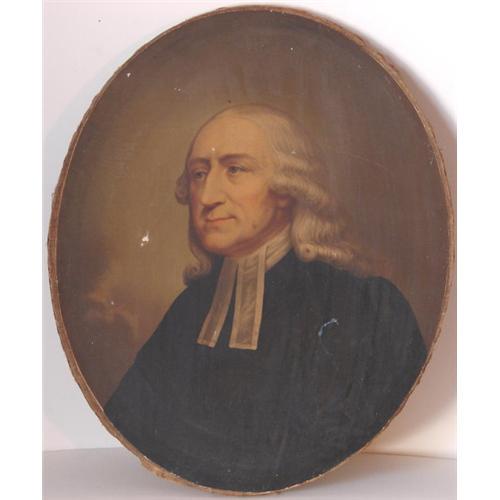 John Jay. Oval chromolithograph of John Jay, the first Justice of the Supreme Court of the United States, by E. C. Middleton. 14" x 17". Several areas of flaked paint, on 1" tear, generally in need of moderate restoration. On verso: ?Warranted Oil Colors. / Entered according to Act of Congress in the year 1866, by E. C. Middleton & Co., in the Clerk?s Office of the District Court of the Southern District of Ohio. / Published by E.C. Middleton & Co., / Cincinnati, O.? Please see accompanying photos for condition. Item is sold as is.