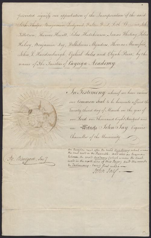 Excellent document signed by Supreme Court Chief Justice, diplomat, founding father and here, Governor of New York, John Jay. Dated 23 March 1801, document concerns the charter of Cayuga Academy in New York, where Jay signs his full name and adds in his hand (apparently amending text of the document): ''An Erazure [sic] next after the word Academy, which is now the last word in the Preamble, and also an Erazure [sic] between the word Academy (which is now the last word in the sixth Line of this Page) and the words In Testimony - being first made.'' As Governor of New York, John Jay served as Chancellor of the Board of Regents for Cayuga Academy, which opened in the fall of 1800. Two page document measures 9.25'' x 14.75'', with embossed paper seal of the Regents of the University of the State of New York intact. Endorsed under seal, ''Mr. Bloodgood, Secry''. Small loss at folds professionally repaired, not materially affecting the text, and completely away from Jay's penned notation and signature. Very good condition with a dark, clear signature.