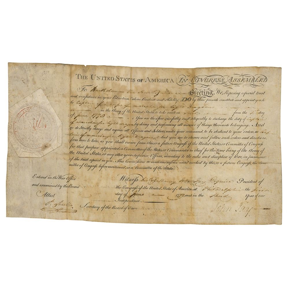 Rare and important Revolutionary War–dated partly-printed vellum DS, one page, 11.5 x 6.5, June 1, 1779. As president of the Continental Congress, Jay appoints Bartholomew Von Heer as "Captain of a corps of Marechaussee Light Dragoons in the Army of the United States." Signed at the conclusion in ink by John Jay. The white paper seal affixed to the left side remains intact. In very good to fine condition, with staining, toning, and the signature several shades light but fully legible.