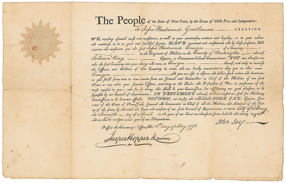 American statesman (1745–1829) who served variously as President of the Continental Congress, diplomat, and, from 1789 to 1795, first Chief Justice of the Supreme Court. Partially printed DS, one page, 16.25 x 10.25, May 8, 1798. A military appointment for Jesse Woodward as ensign in the Regiment of Militia in Washington County, New York. The embossed paper seal remains intact at upper left. In very good to fine condition, with intersecting storage folds, a few small spots, and small holes at intersections of folds. The white seal is intact and only slightly worn. The signature is bold and unaffected by any faults.