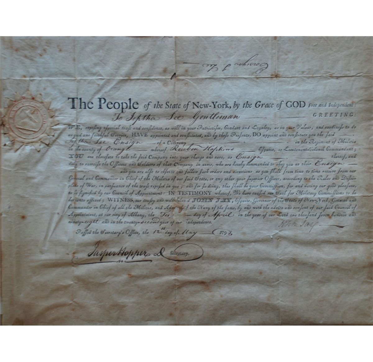 American statesman (1745–1829) who served variously as President of the Continental Congress, diplomat, and, from 1789 to 1795, first Chief Justice of the Supreme Court. Partly-printed DS, one page, 15.25 x 9.5, May 1798. Jay appoints Jeptha Lee to Ensign.