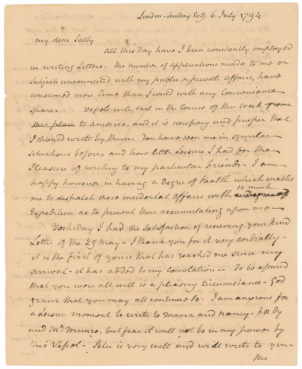 Handwritten draft for a letter to his wife Sally, unsigned, three pages on two sheets, 7.5 x 9.25, July 6, 1794. In part: “I have been constantly employed in writing letters. The number of applications made to me on subjects unconnected with my public or private affairs, have consumed more time than I could with any convenience spare. Vessels will sail in the course of this week to America, and it is necessary and proper that I should write by then. You have seen me in similar situations before, and how little leisure I had for the pleasure of writing to my particular friends. I am happy however in having a degree of health which enables me to dispatch these incidental affairs with so much expedition as to prevent their accumulating upon me.