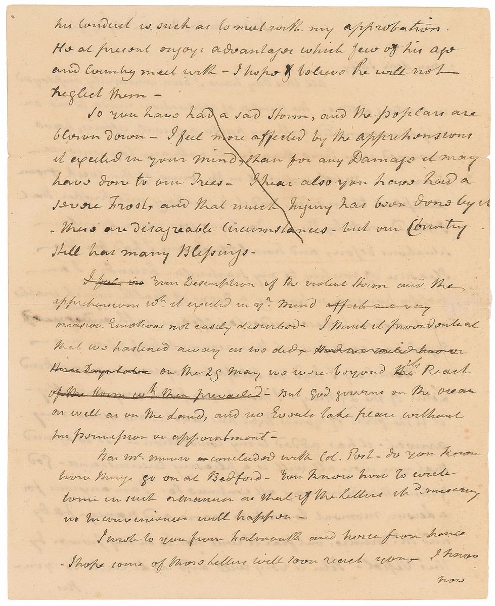 Yesterday I had the satisfaction of receiving your kind letter…Your description of the violent storm and the apprehensions wh[ich] it excited in yr mind occasion emotions not easily described. I think it providential that we hastened away as we did. On the 29 May we were beyond its reach—but God governs on the oceans as well as on the land, and no events take place without his permission or appointment…