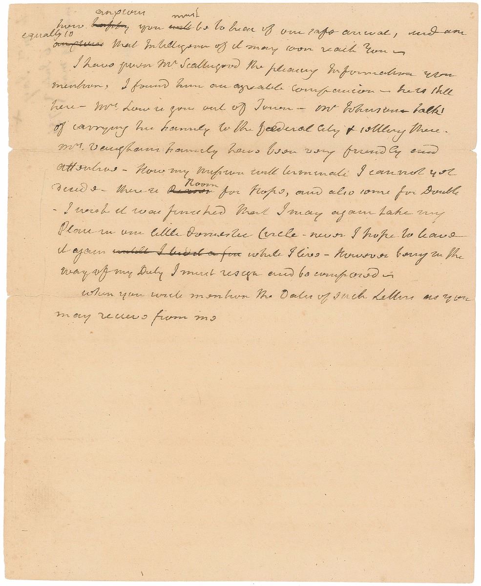 How my mission will terminate I cannot yet decide. There is room for hope, and also some for doubt. I wish it was finished that I may again take my place in our little domestic circle—never I hope to leave it again while I live. However being in the way of my duty I must resign and be comforted.” Jay makes several strike-throughs and emendations throughout. Partial separations to expected mailing folds and light show-through from writing to opposing sides, otherwise fine condition