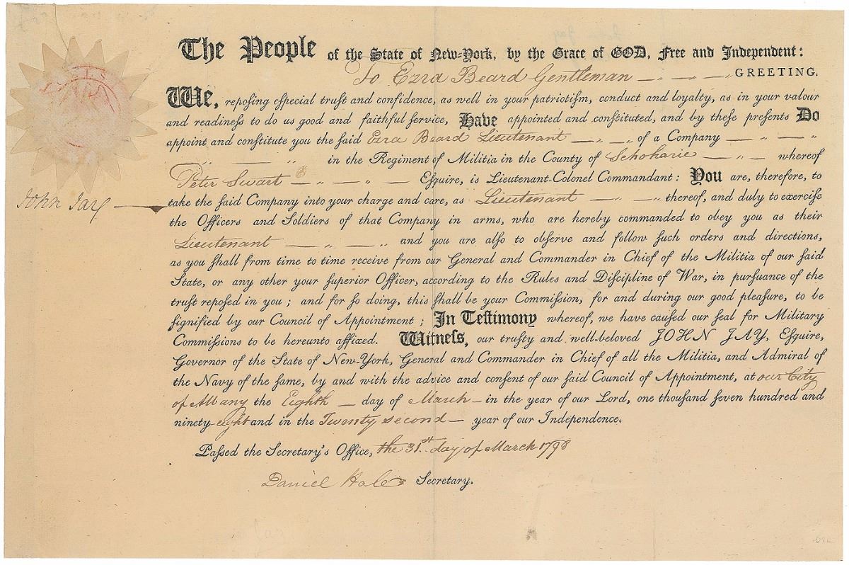 Partly-printed DS, one page, 13.75 x 9, March 31, 1798. Governor Jay appoints Ezra Beard as a “Lieutenant of a Company in the Regiment of Militia in the County of Schoharie whereof Peter Swart Esquire, is Lieutenant–Colonel Commandant.” Signed by Jay in the left border, and countersigned by Secretary Daniel Hale. The embossed paper seal remains affixed to upper left corner. In fine condition, with trimmed edges and an old mounting strip on reverse edge. Accompanied by an engraved portrait of Jay bearing a facsimile signature.