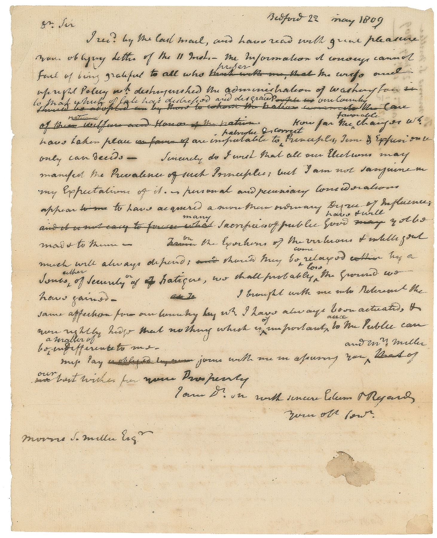 Handwritten draft of a letter by John Jay, unsigned, one page, 8 x 10, May 22, 1809. Written from Bedford to Morris S. Miller, replying to the news that the Federalists, for the first time in a decade, had won New York's elections. In full: "I have received by the last mail, and have read with great pleasure your obliging letter of the 11 Inst.—The information it conveys cannot fail of being grateful to all who prefer the wise and upright policy wh'h distinguished the administration of Washington to that which of late has distressed and disgraced our county. How far the favorable changes wh. have taken place are imputable to patriotic and correct principles, time and experience only can decide. Sincerely do l wish that all our elections may manifest the Prevalence of such principles; but I am not sanguine in my expectations of it.—personal and pecuniary conditions appear to have acquired a more than ordinary degree of influence; many sacrifices of public good have & will yet be made to them—On the exertions of the virtuous and intelligent much will always depend; should they become relaxed by a sense of either security or of fatigue, we shall probably lose the ground we have gained. I have brought with me into retirement the same affection for our country by which I have always been actuated, & you rightly judge that nothing which is of importance to the public can be a matter of indifference to me. Mrs. Jay joins with me in assuring you and Mrs. Miller of our best wishes for your Prosperity." In fine condition, with two small stains in the lower blank area.
