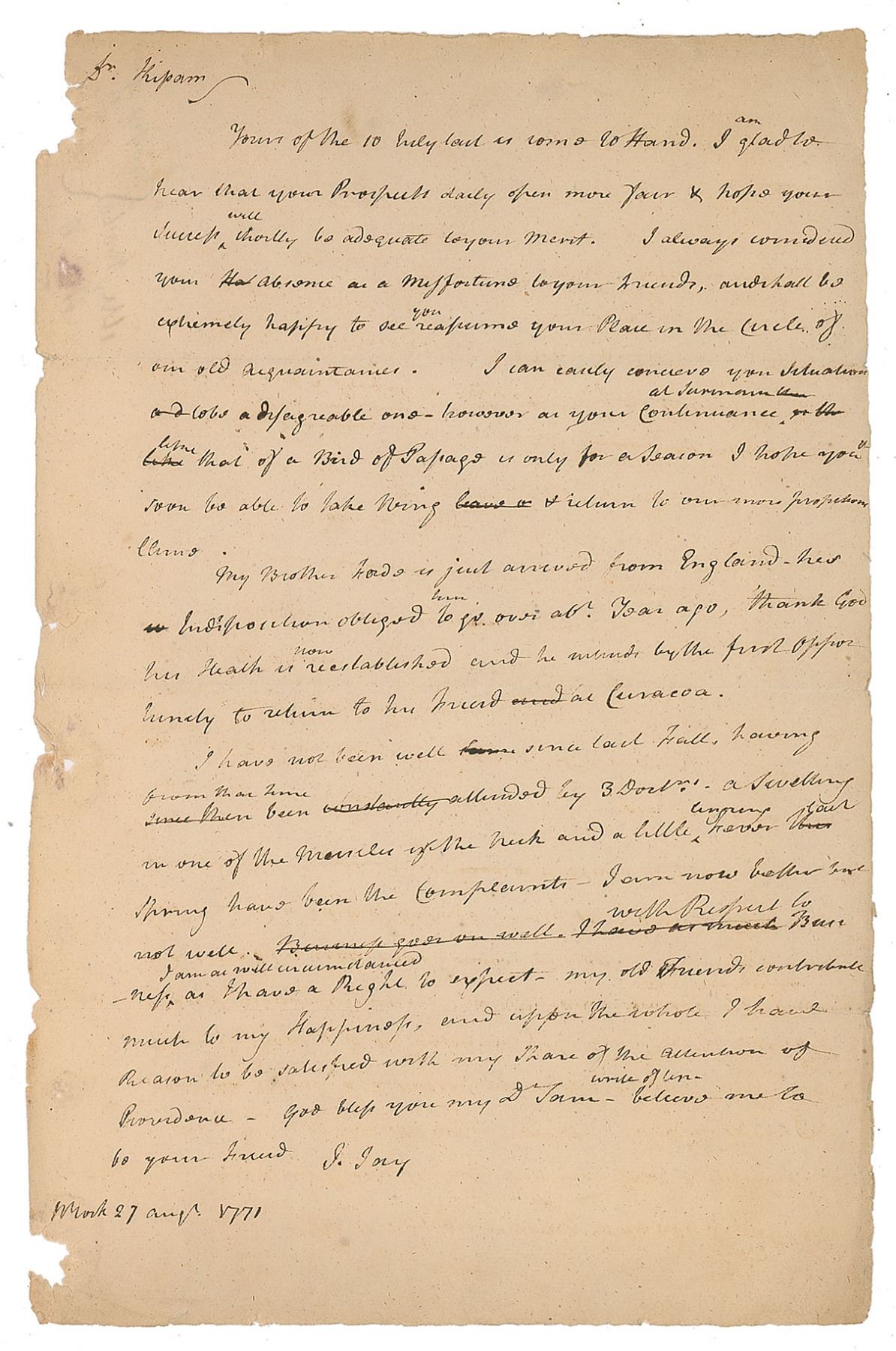 ALS, signed “J. Jay,” one page, 8.5 x 13, August 27, 1771. Letter to Dr. Samuel Kissam, discussing some personal matters, in part: "I am glad to hear that your Prospects daily open more…& hope your success will…be adequate to your merit. I always considered your absence as a misfortune…and shall be extremely happy to see you resume your place in the circle of our own acquaintances…I have not been well…With respect to business, I am as well circumstanced as I have a right to expect. My old friends contribute much to my Happiness, and upon the whole I have Reason to be satisfied with my share of the allowance of Providence." In very good to fine condition, with paper loss along the left edge, affecting no text.