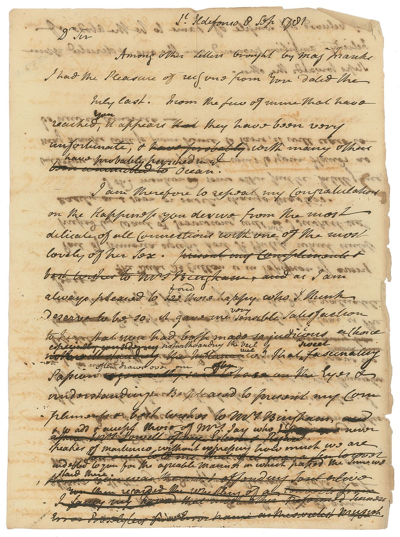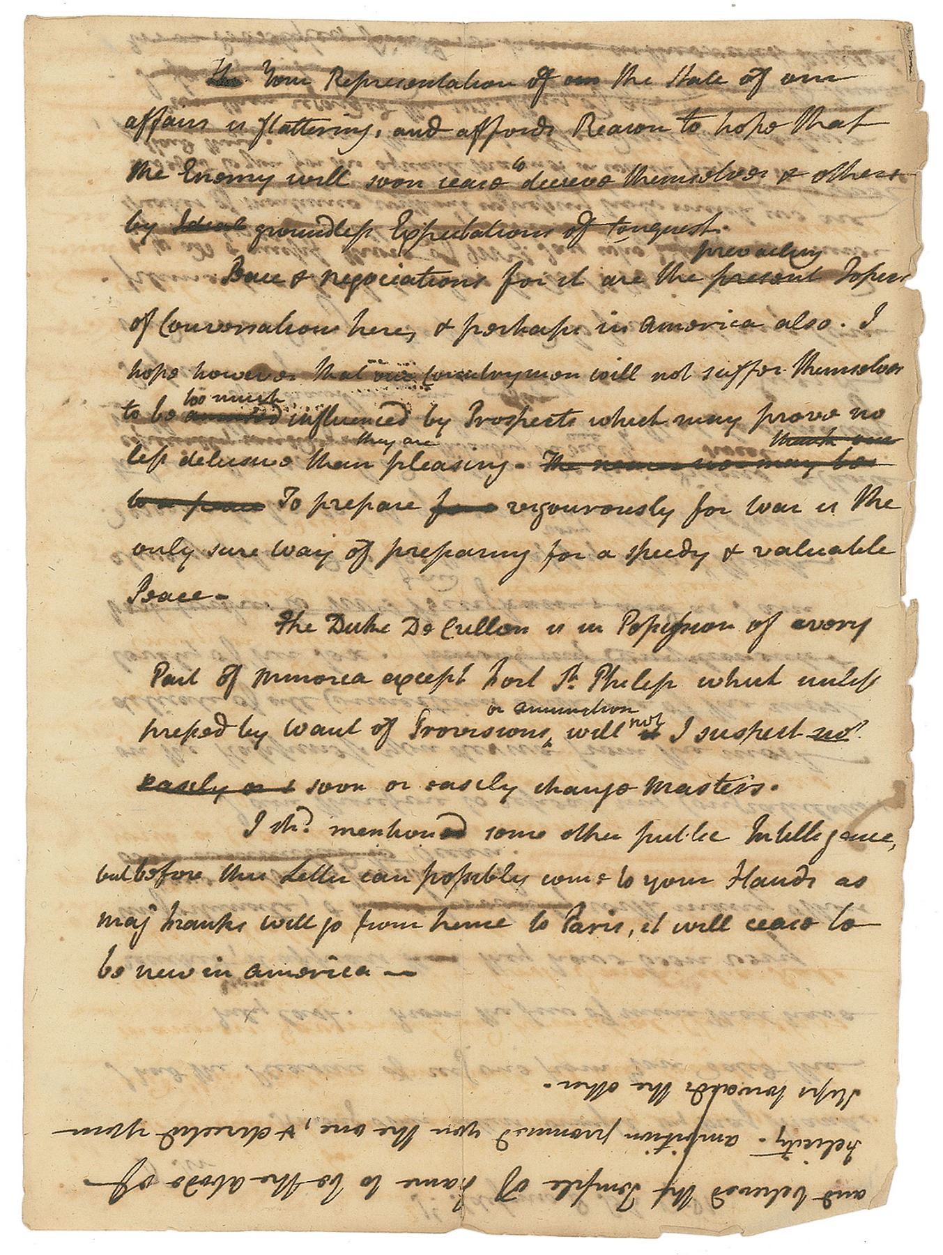 Revolutionary War–dated handwritten draft of a letter by Jay, unsigned, five pages on three sheets, 5.75 x 8, September 8, 1781. A draft to William Bingham written from San Ildefonso, Spain, with numerous handwritten corrections and emendations. Jay writes, in part: "The state of our affairs is flattering and affords reason to hope that the enemy will soon cease to deceive themselves and others by groundless expectations and conquests. Peace and negotiations…are the prevailing topics…here…I hope…our countrymen will not…be too much influenced by prospects which may prove no less delusive than they are pleasing. To prepare vigorously for war is the only sure way of preparing for a speedy and valuable peace." Jay mentions the successes for the Duc de Crillon, then continues: "I make it a rule to be perfectly silent in all my letters…Much injustice is often done by taking reports as facts, and forming opinions of men from the suggestions which may arise from envy or interested partialities…I have lived too long to credit all I hear."