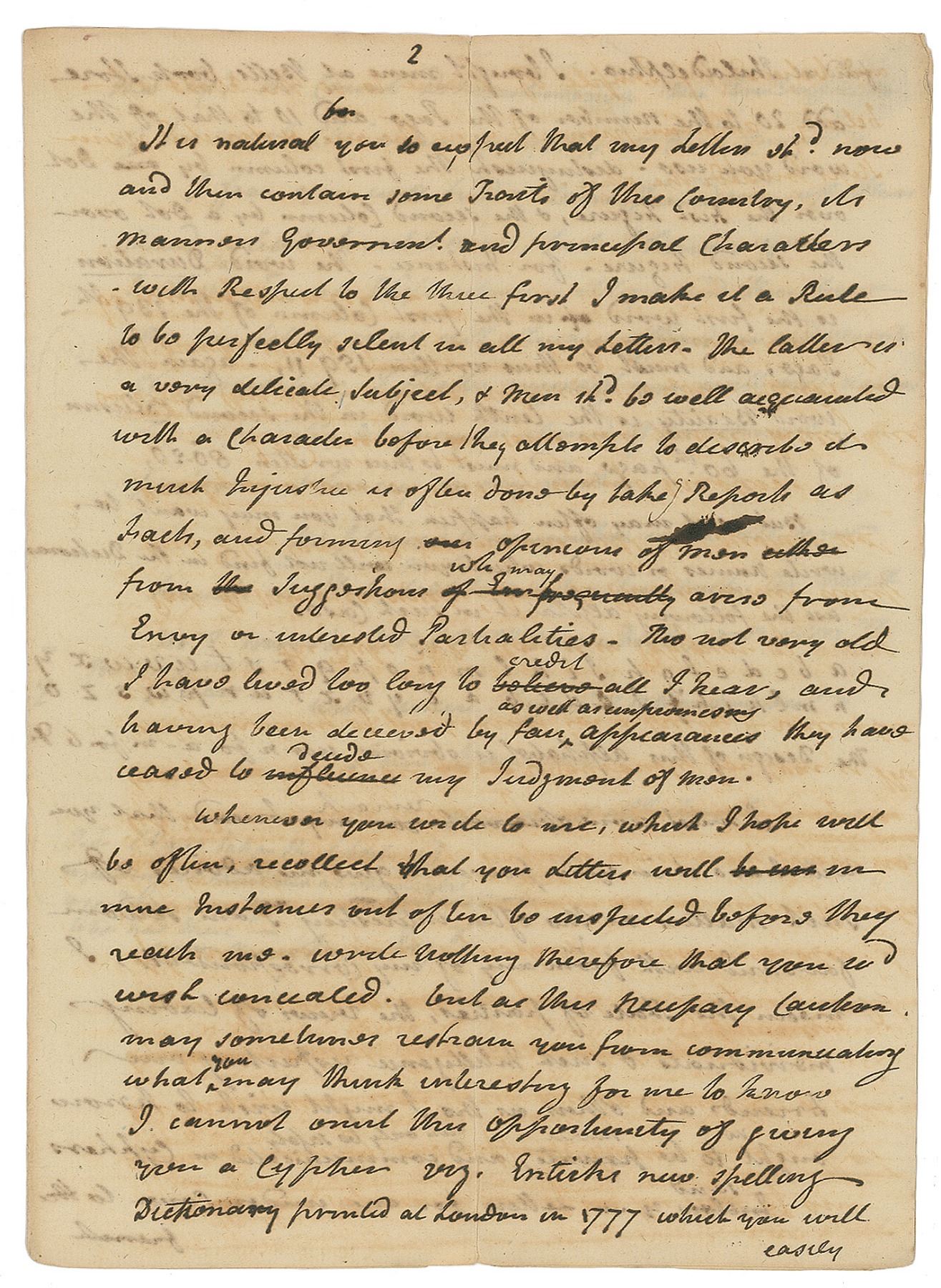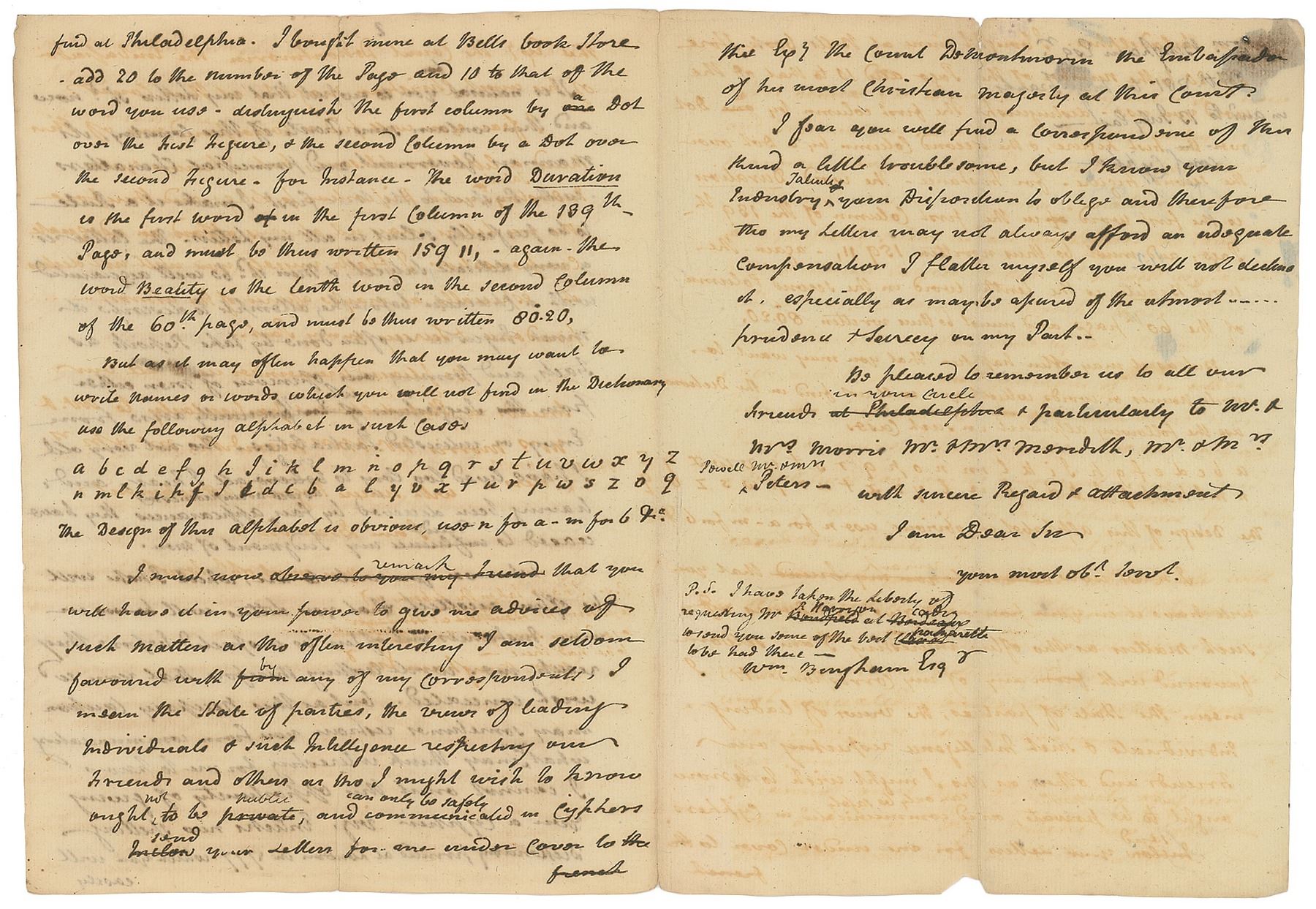 He instructs Bingham to write him nothing which he would not like others to read, and recommends communicating via cipher. He suggests using "Entick's new spelling Dictionary printed at London in 1777…add 20 to the number of the Page and 10 to that of the word you use." He provides examples and further instructions for using this numerical code, and supplies an additional alphabetic code for proper nouns not found in the dictionary. He concludes: "You will have it in your power to give me advices of…the state of parties, the view of leading individuals…[which] ought not to be public and can only be safely communicated in cipher." In very good to fine condition, with tiny edge tears. During this period, Jay was serving as the first American minister to Spain, on a mission to get financial aid, commercial treaties, and recognition of American independence. Although Spain refused to recognize America's independence until 1783, Jay did secure a loan of $170,000 to the US government.
