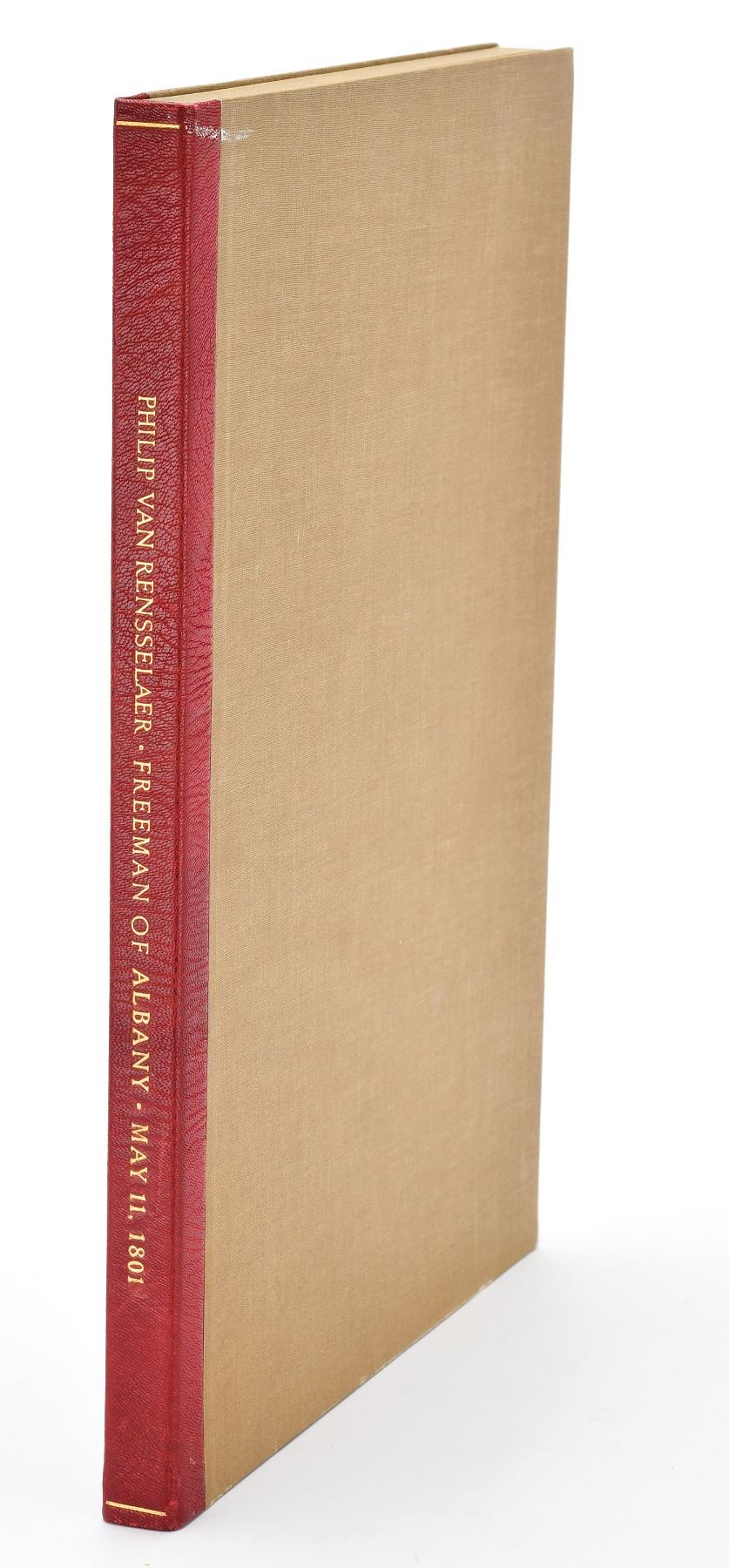 Includes the vellum manuscript certificate awarded to Jay, signed by Mayor Philip S. Van Rensselaer of Albany, "P. S. Van Rensselaer," one page, 11 x 8, May 11, 1801, in part: "I Philip S. Van Rensselaer Esquire, Mayor of the City of Albany, Have admitted and received, and do hereby admit and receive, His Excellency John Jay Esquire, Governor of the State of New York, to be a Freeman of the said City." Retains the official city seal affixed in the left margin. Accompanied by a gorgeous custom-made red morocco hardcover presentation folder contained within a custom clamshell case.
